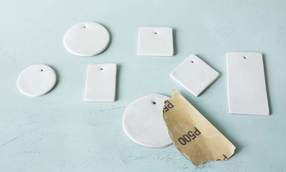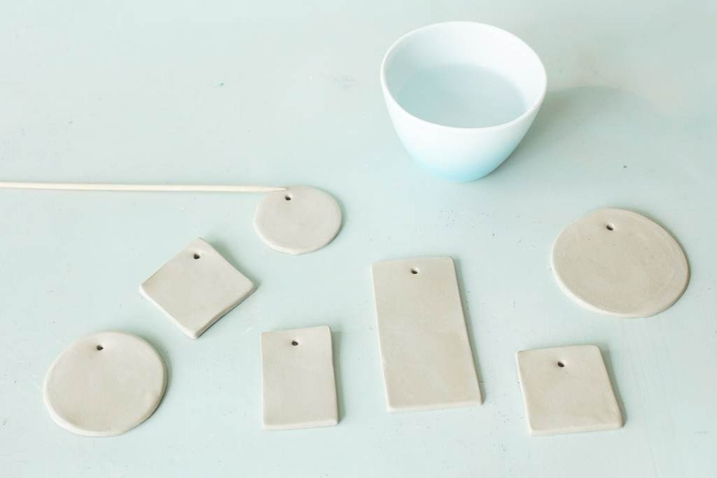 Percez un trou dans le haut de chaque forme pour pouvoir l’accrocher par la suite. Si besoin, lissez et arrondissez les angles de toutes les formes au doigt, avec un peu d’eau.