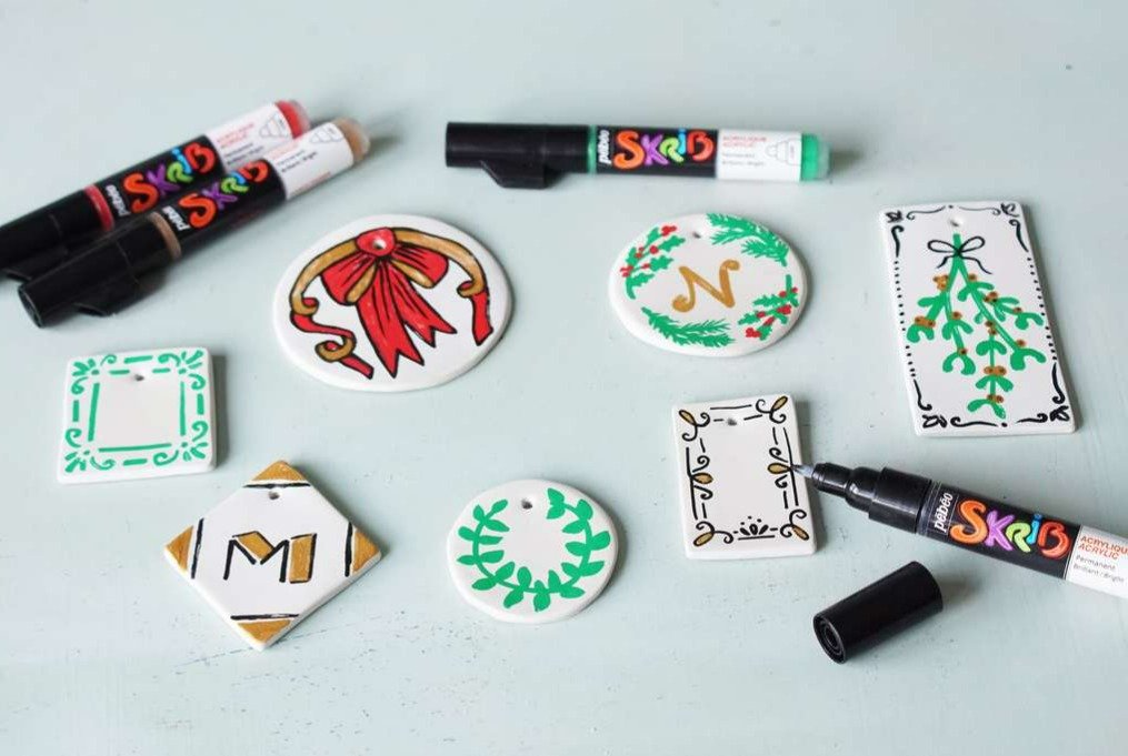 - En s’inspirant des photos des étiquettes réalisées, dessinez des ornements sur chaque étiquette : couronne végétale, monogramme, noeud… Vous pouvez les dessiner au crayon à papier avant de vous lancer avec les feutres Skrib acrylique.