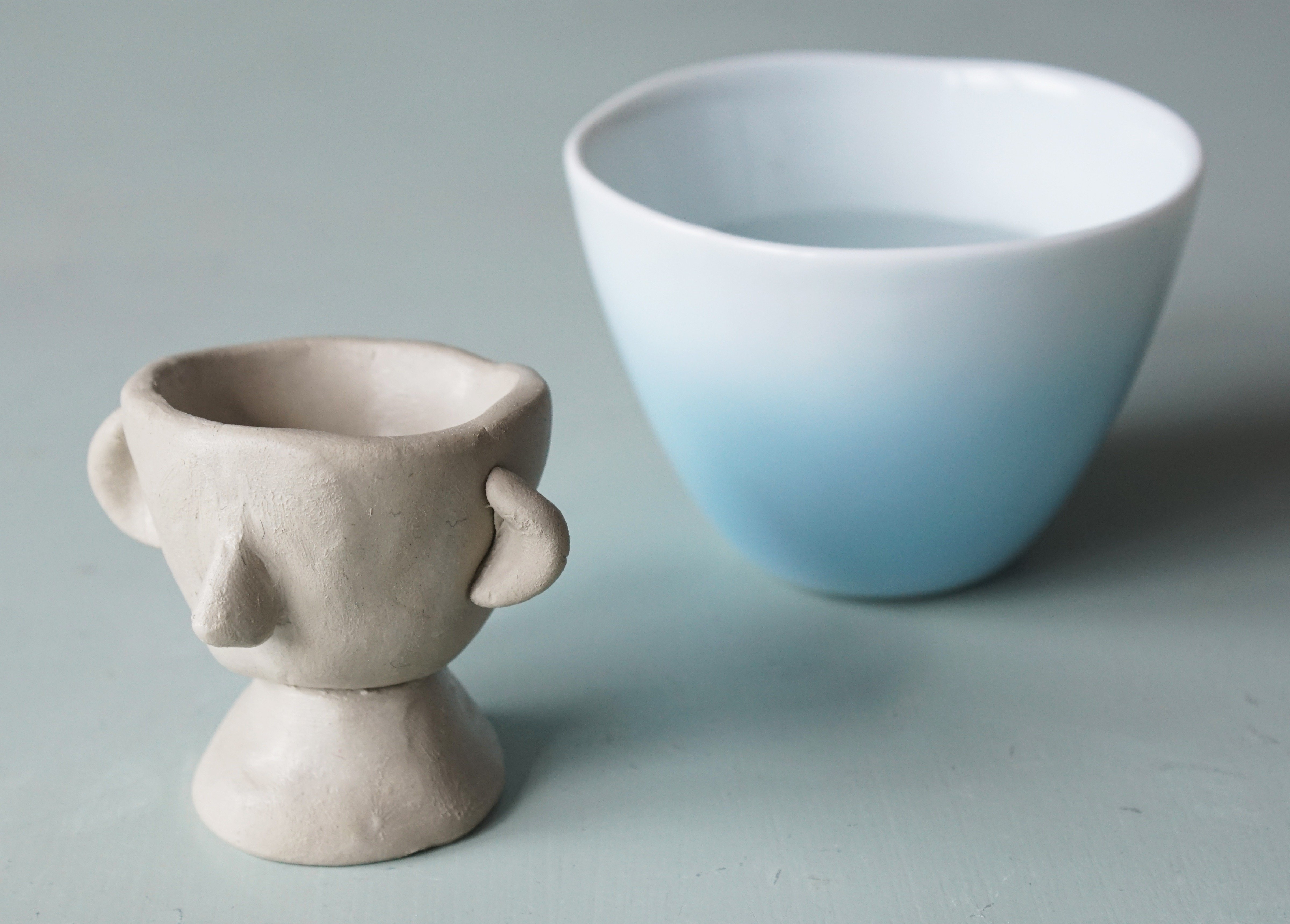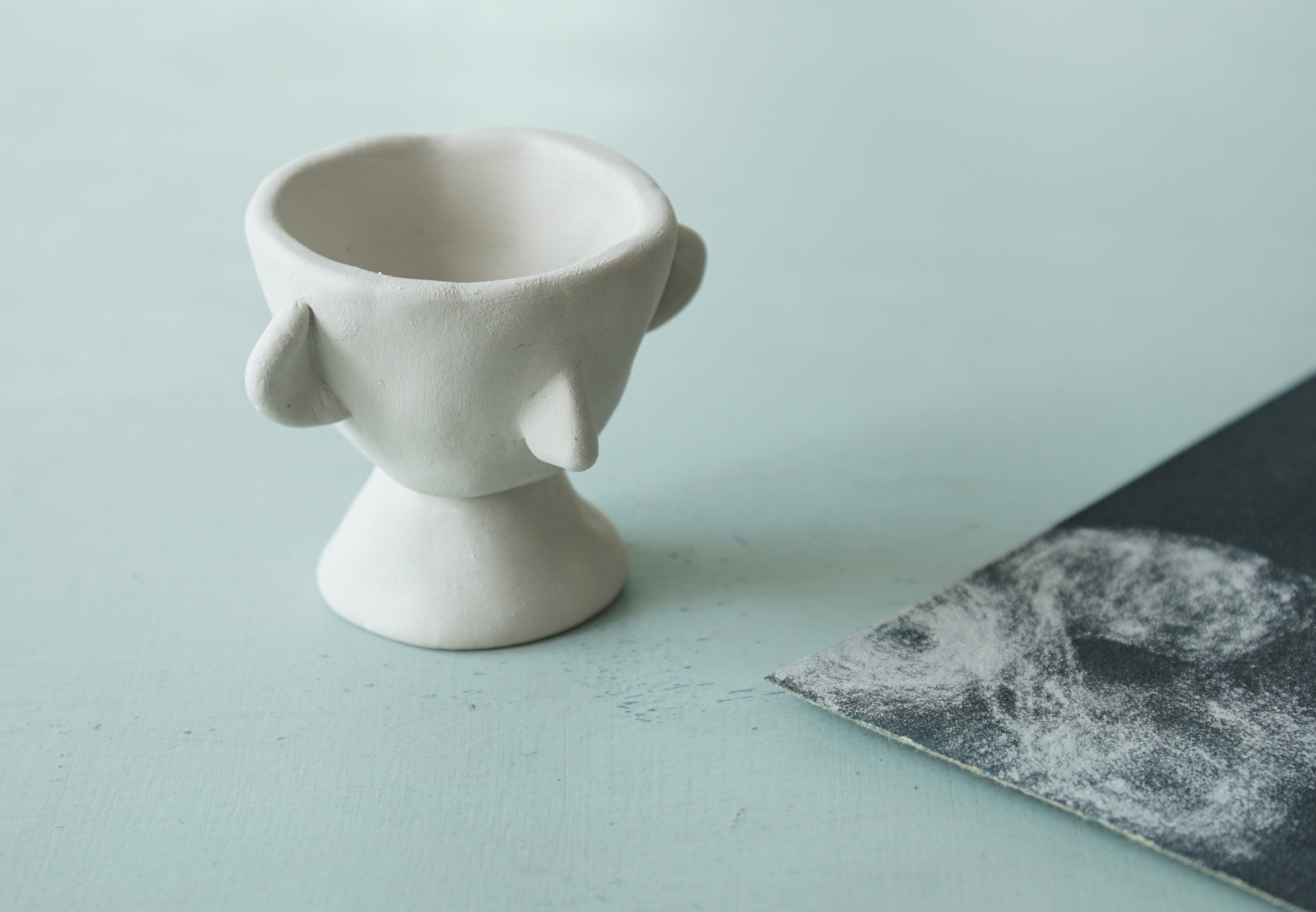 - Avec un peu d’eau, colle le nez et les oreilles sur le coquetier. Fignole les soudures à l’aide des outils à modeler pour que les jonctions ne se voient plus.