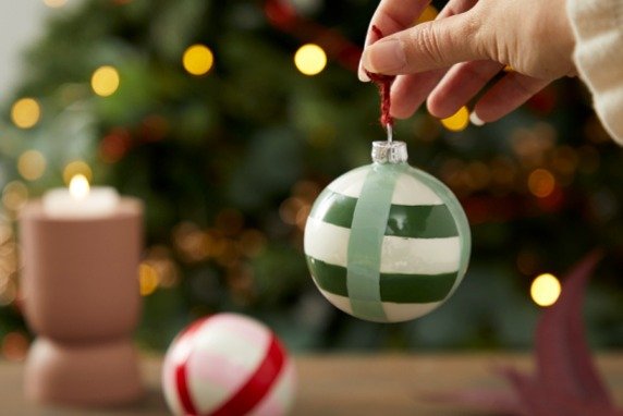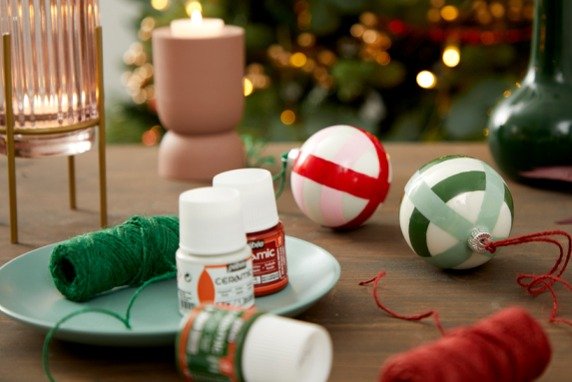 Customisez des boules de Noël style Vichy avec les couleurs céramique. Un DIY facile à suivre pour décorer votre sapin de Noël.
