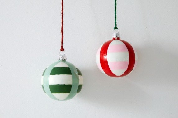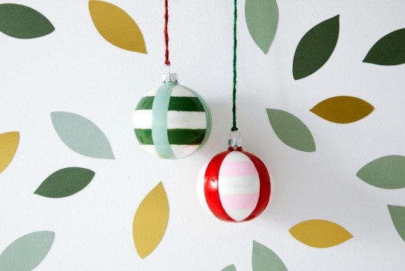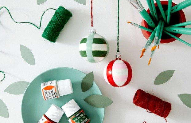 - Commencez par peindre des rayures horizontales ou verticales sur les boules à l’aide d’un pinceau fin.