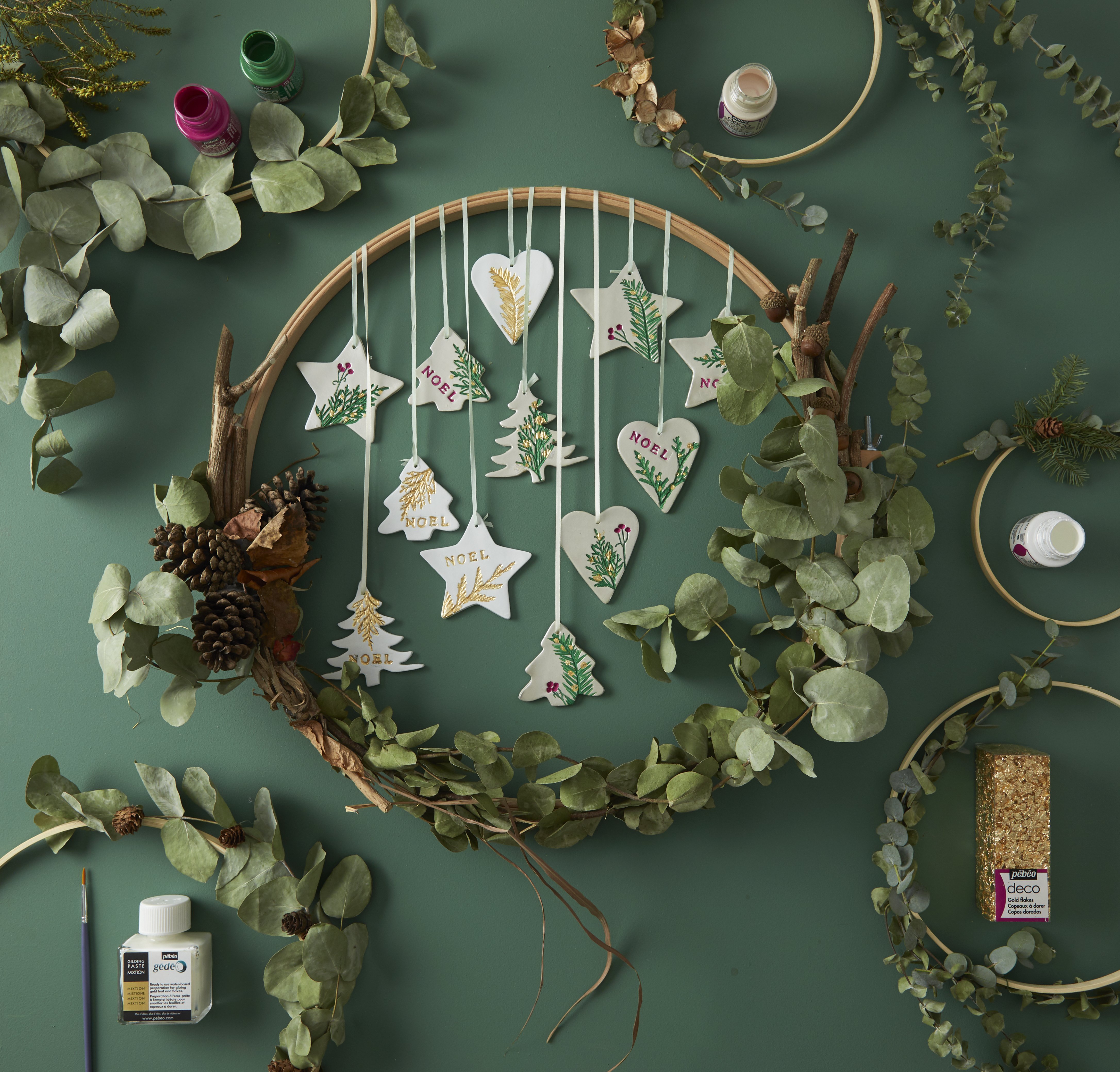Fabriquez vous mêmes des pampilles en argile, une pointe de déco nacré et un soupçon de couleur déco doré. Une belle couronne DIY.