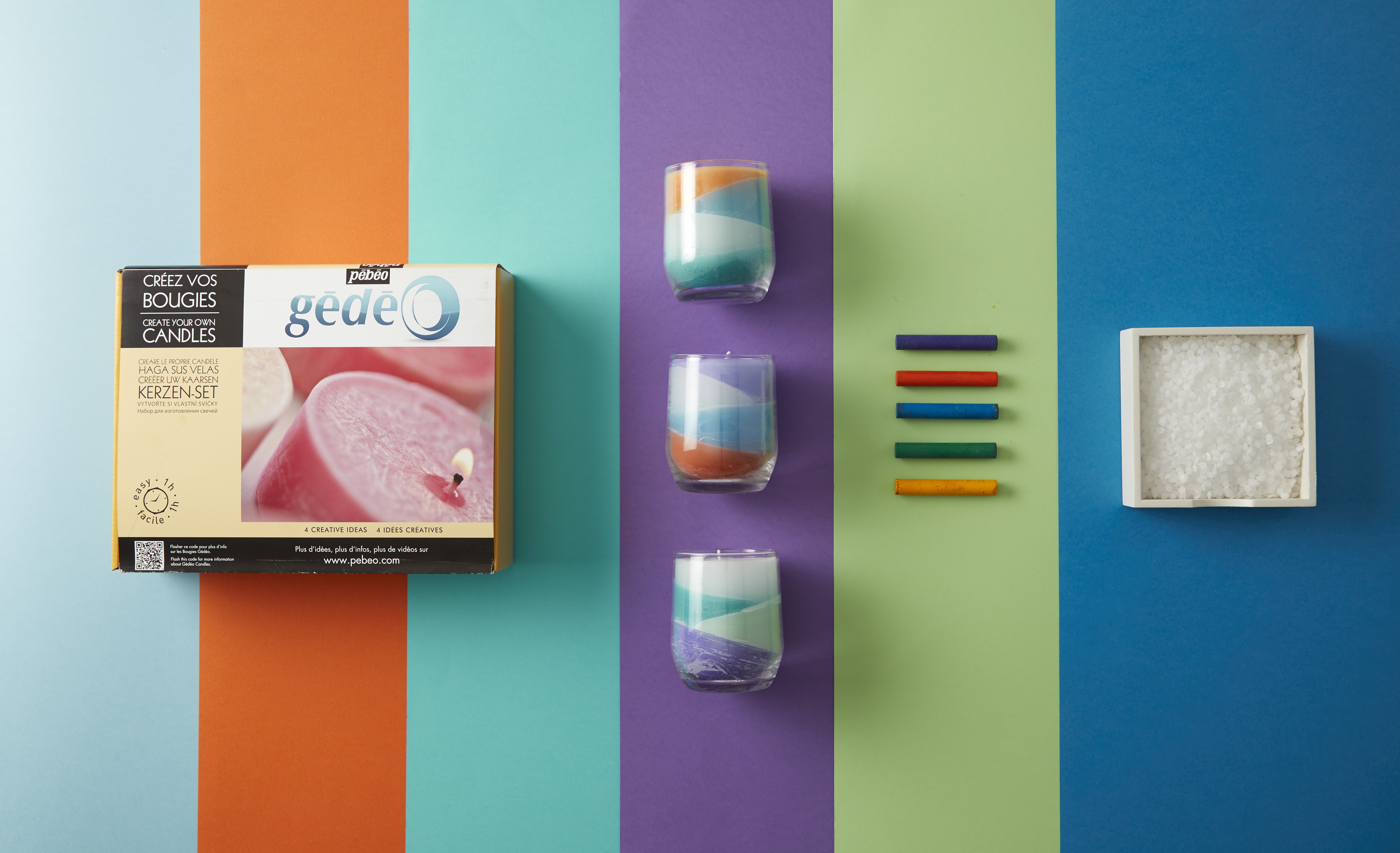 A l’aide de notre kit, créez vos propres bougies en alternant couleurs et mouvements.