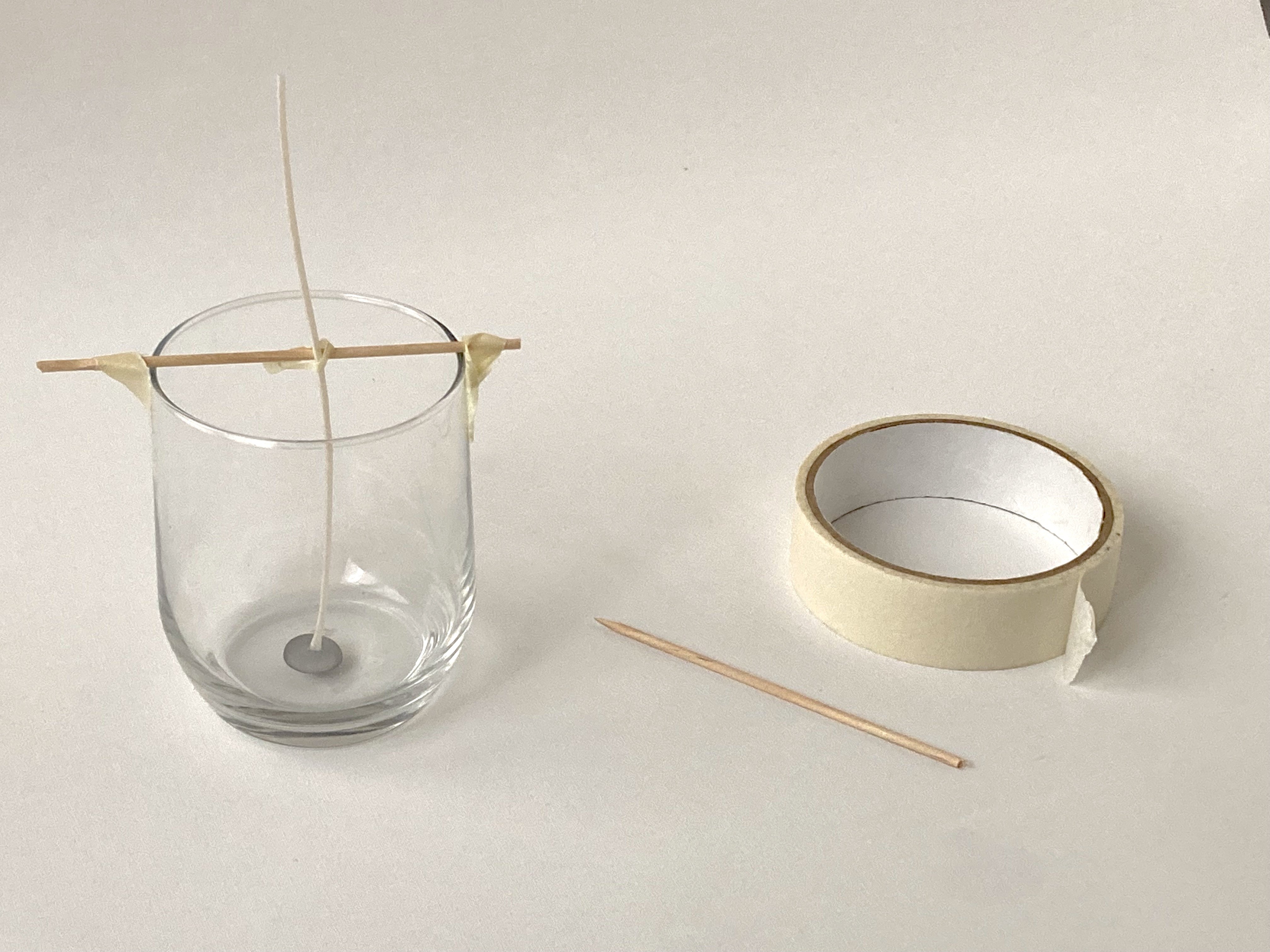 • Laissez la cire prendre puis fixez la mèche tendue et bien centrée sur la baguette avec un petit morceau du ruban adhésive.
