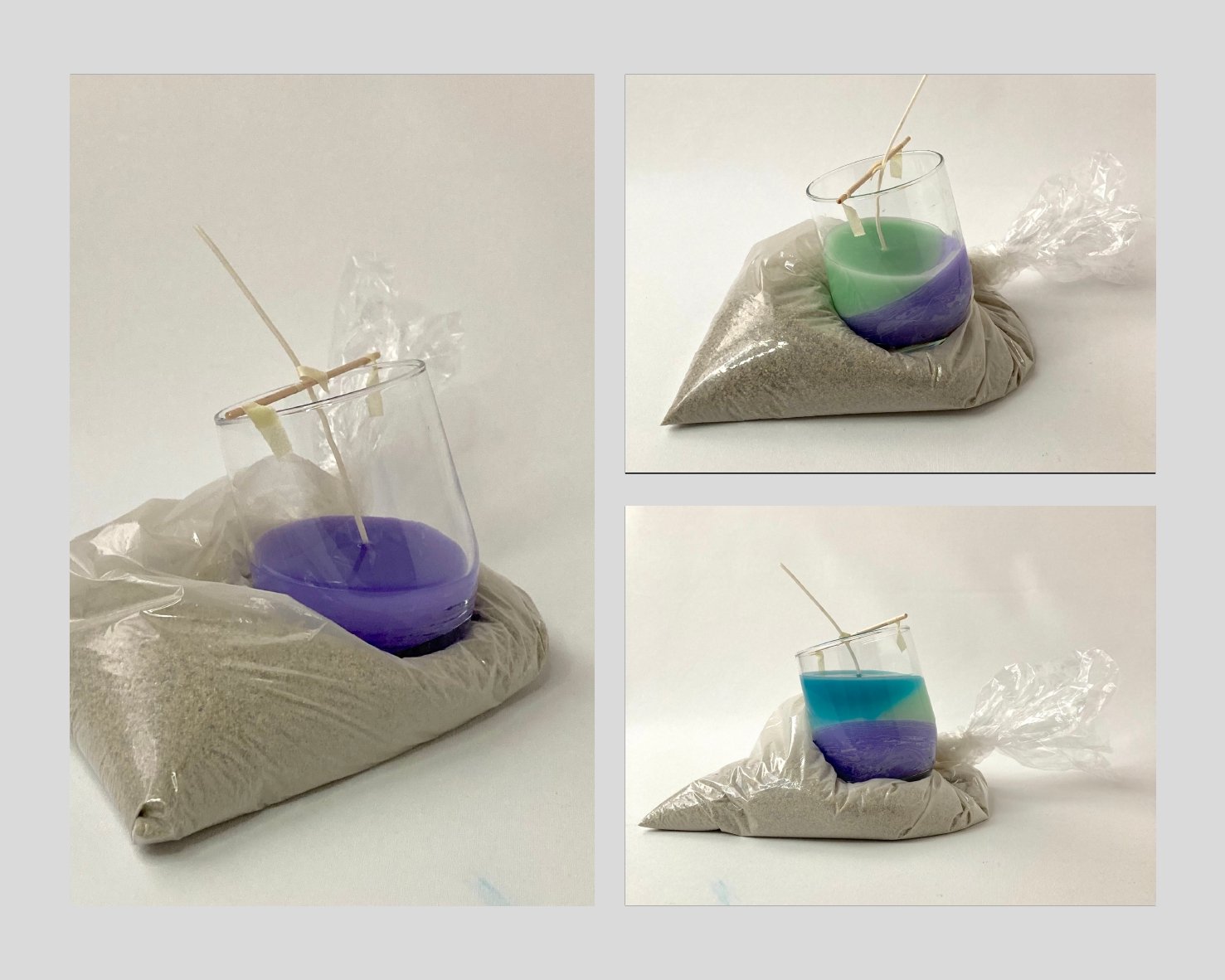 • Calez le verre en biais dans le sac de sable : l’inclinaison va donner la forme du premier coloris de cire.
