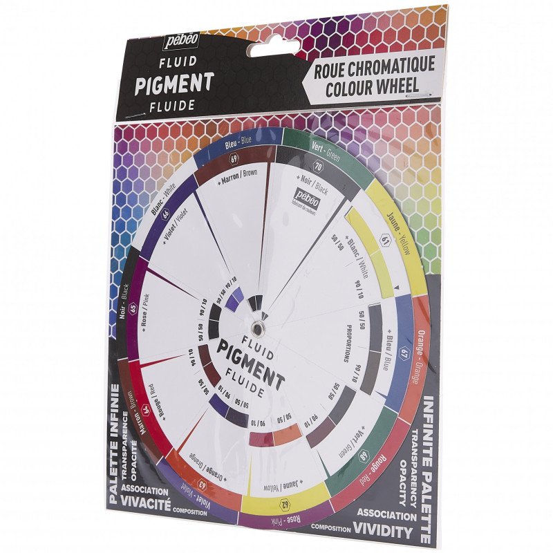 Questa ruota cromatica è stata progettata appositamente per i colori di base Fluid Pigment. Questo strumento ti aiuterà a determinare più rapidamente i dosaggi tra due colori per ottenere la tinta che preferisci (lato 1) e per poter giocare con il grado di opacità di un determinato colore (lato 2).