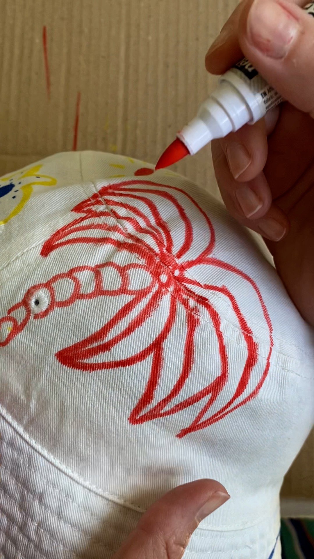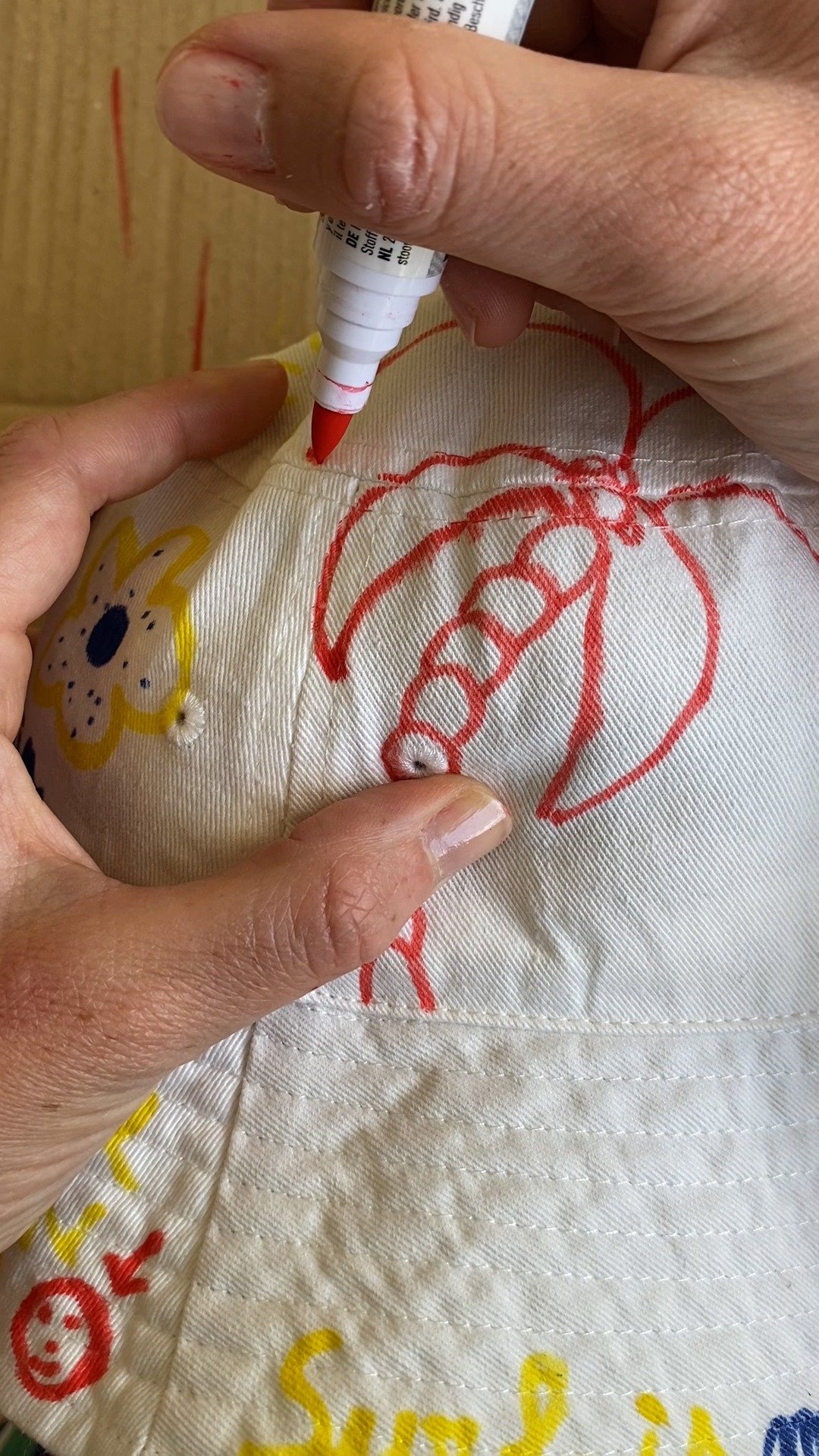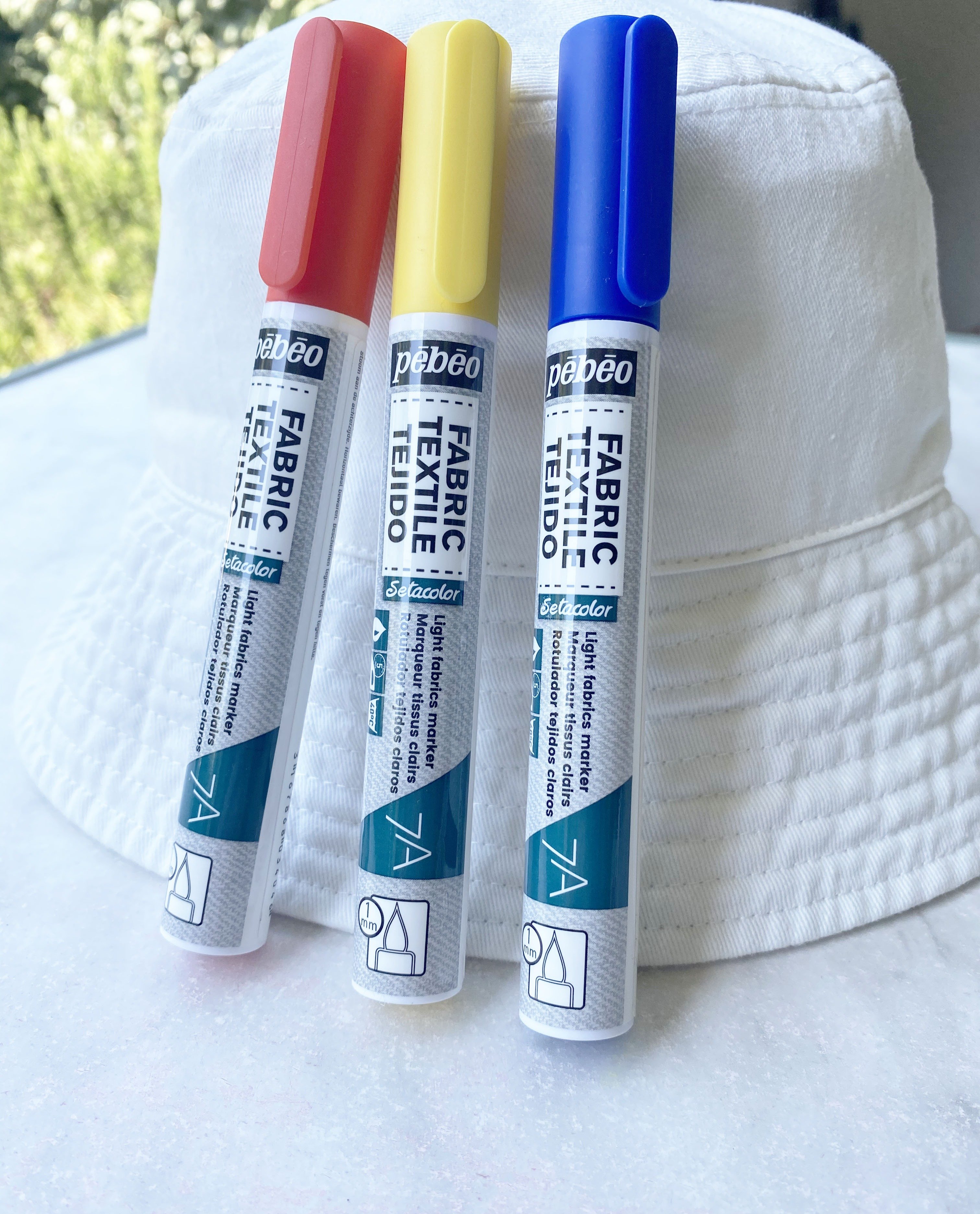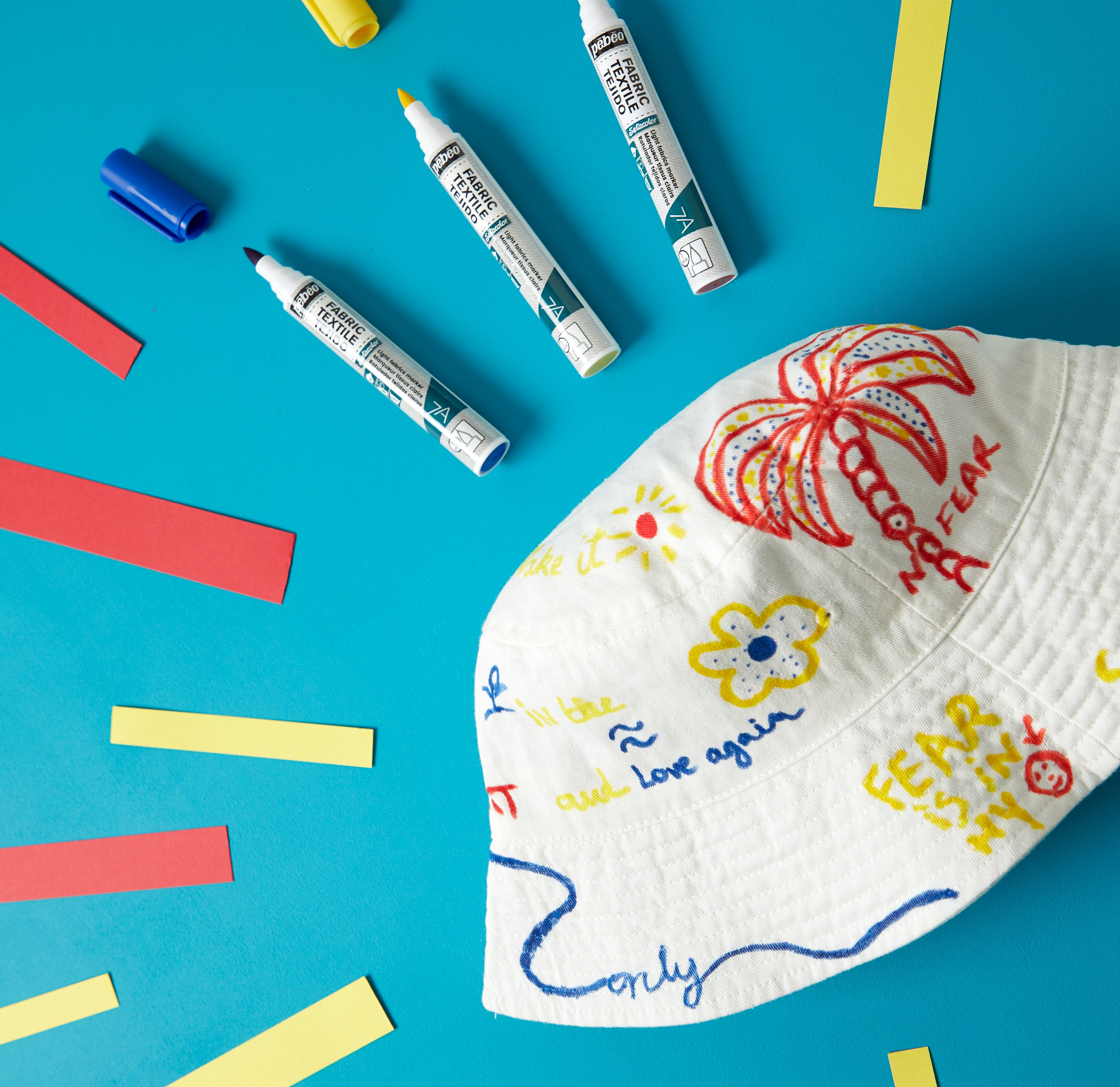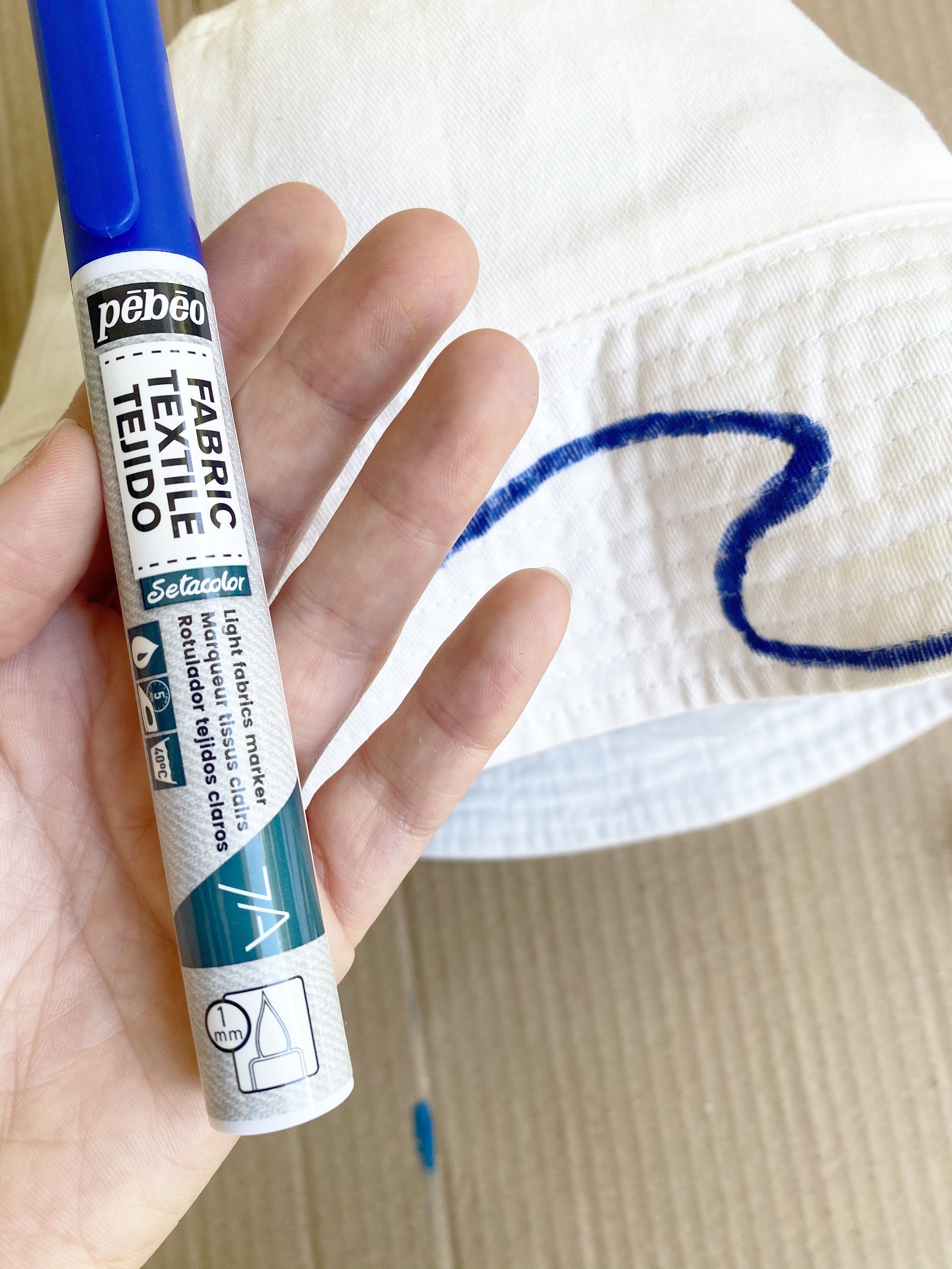 Utilisez les marqueurs SETACOLOR à pointes fines pour dessiner vos motifs sur le bob. Ne pas hésiter à revenir sur certains tracés pour bien imbiber le tissu.