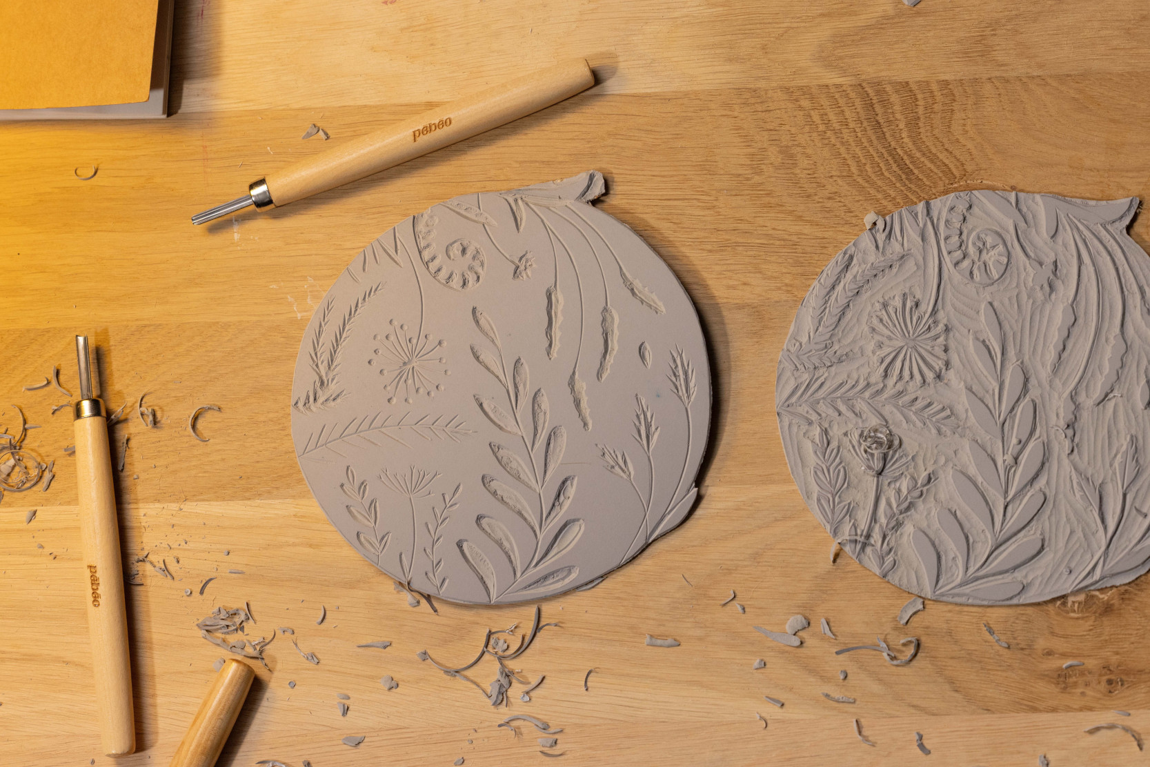 Les gouges Pébéo sont également les outils essentiels pour graver la plaque de linoléum, offrant un équilibre parfait entre qualité, ergonomie et esthétique.