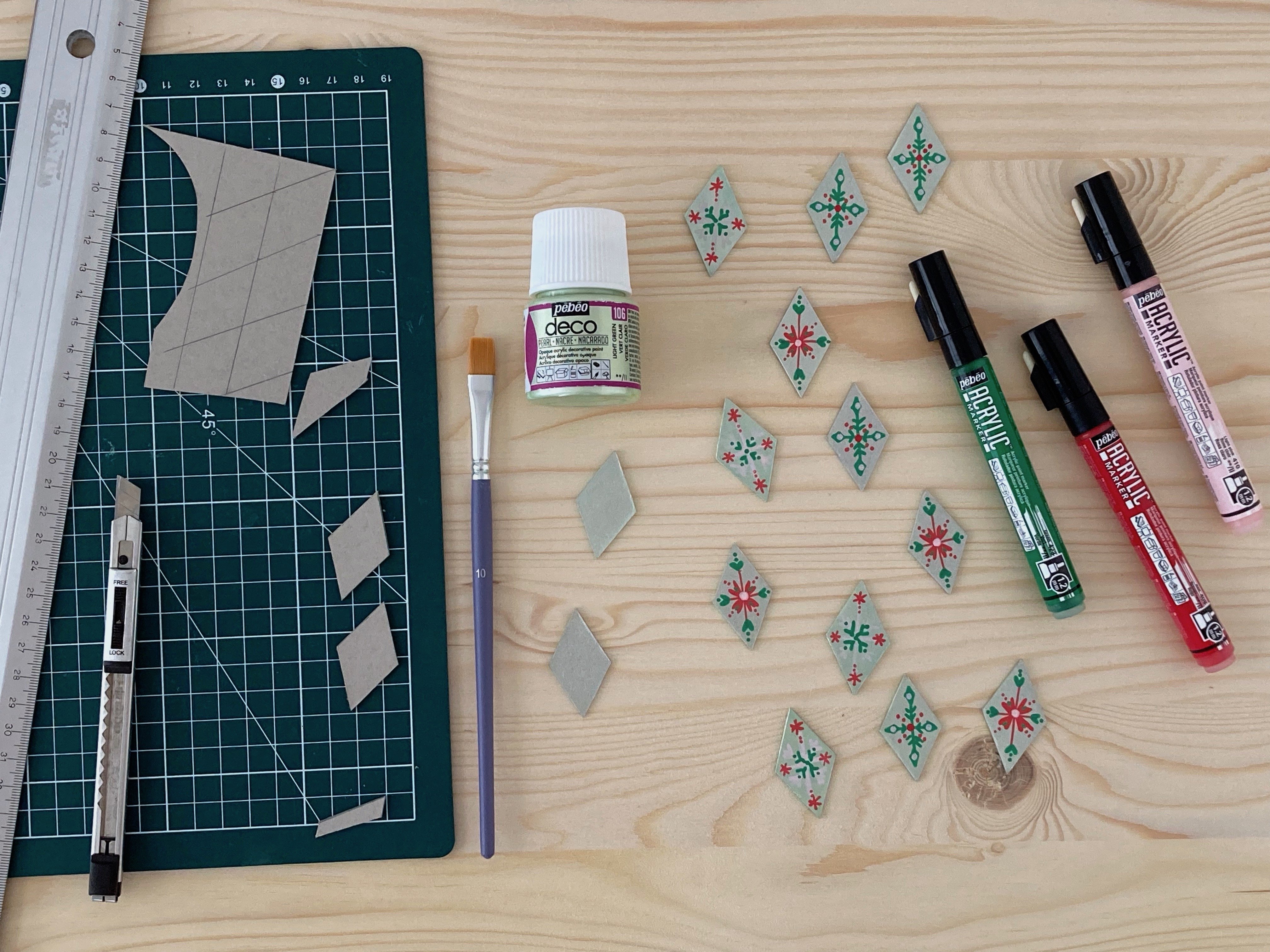 - Из обрезков картона вырежьте ромбики, чтобы украсить буквы. Убедитесь, что они подходящего размера и поместятся на буквах!