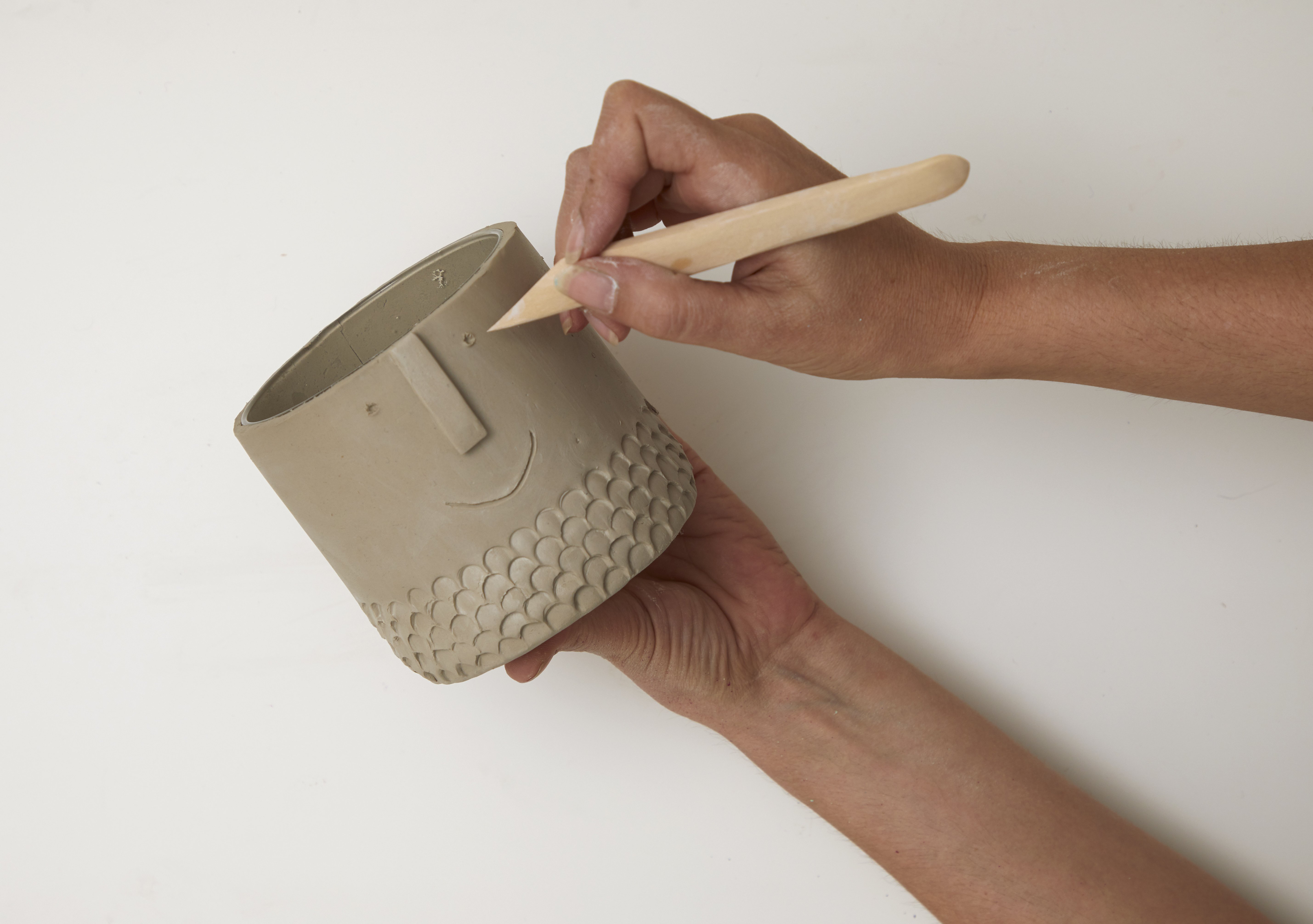 - Нарисуйте на горшке, используя инструменты для лепки или подручный материал (зубочистку, палочку), остальную часть лица и орнамент.
