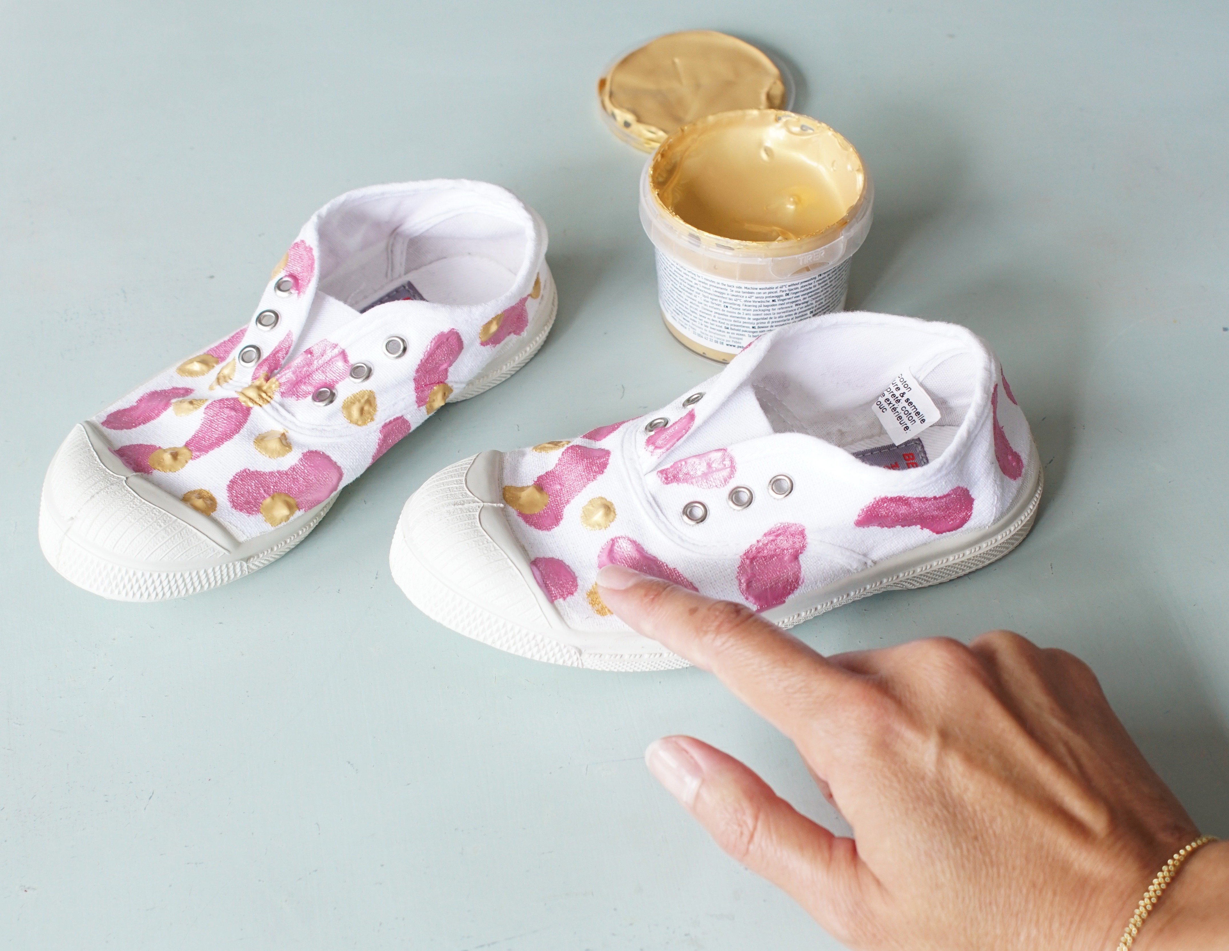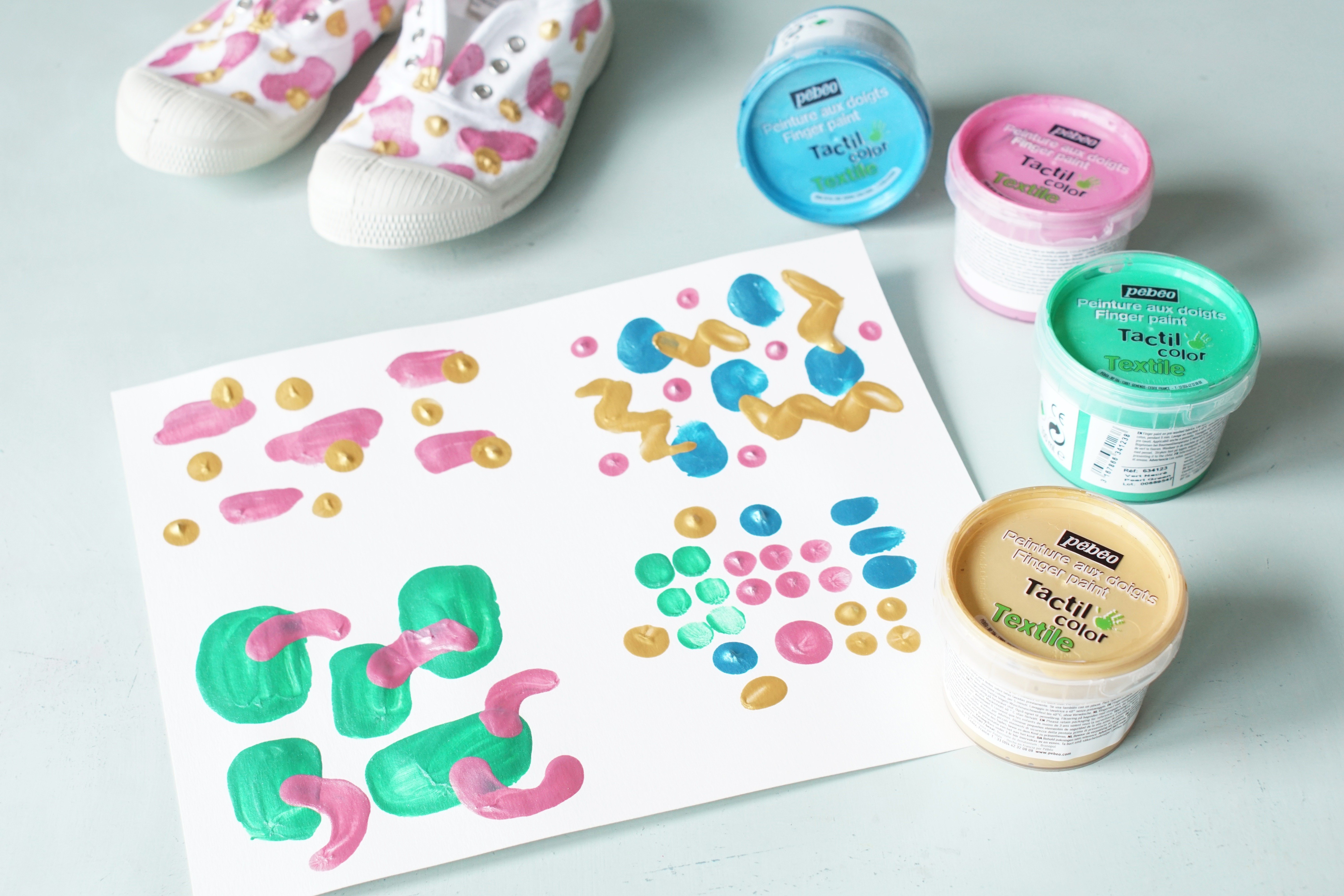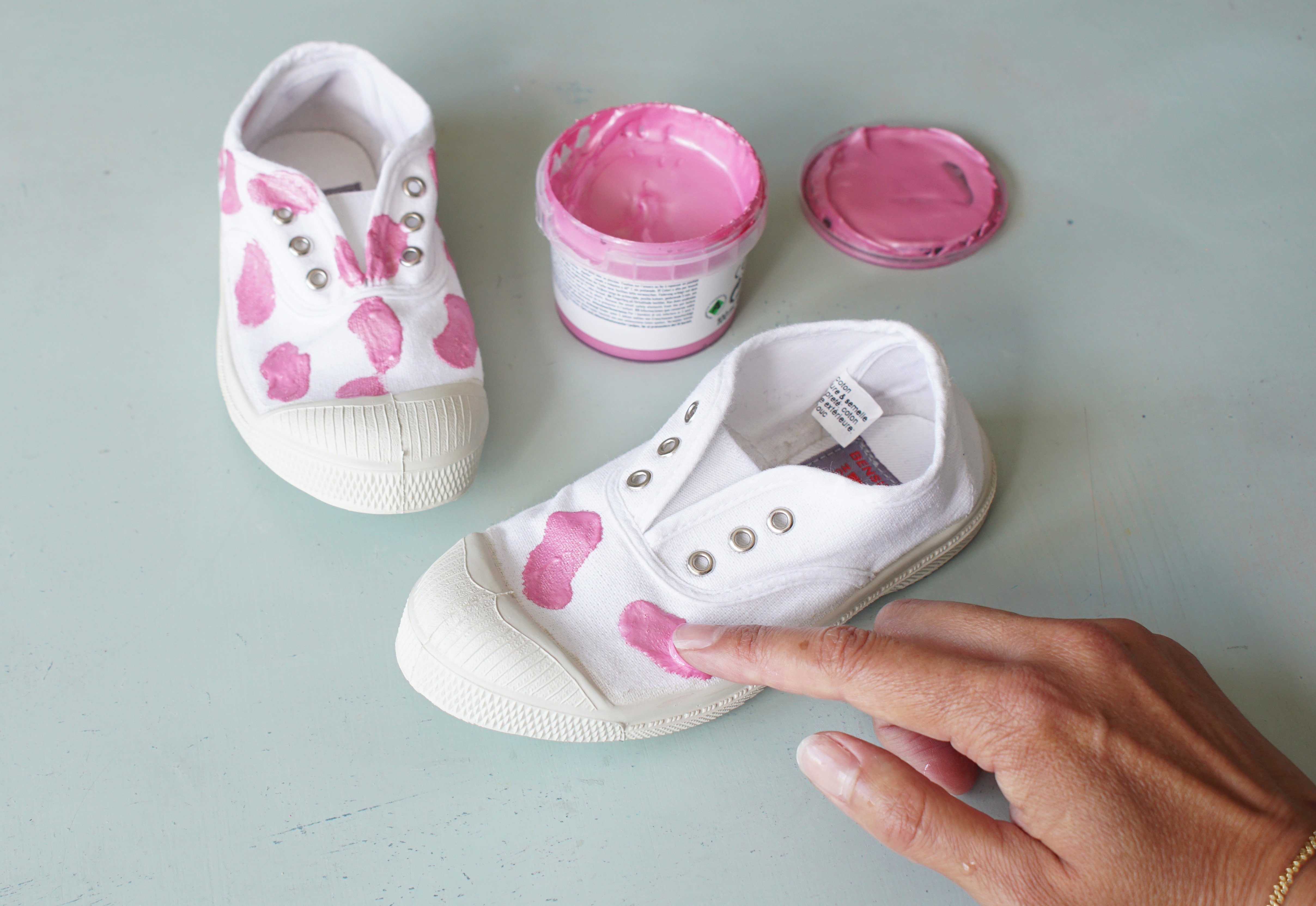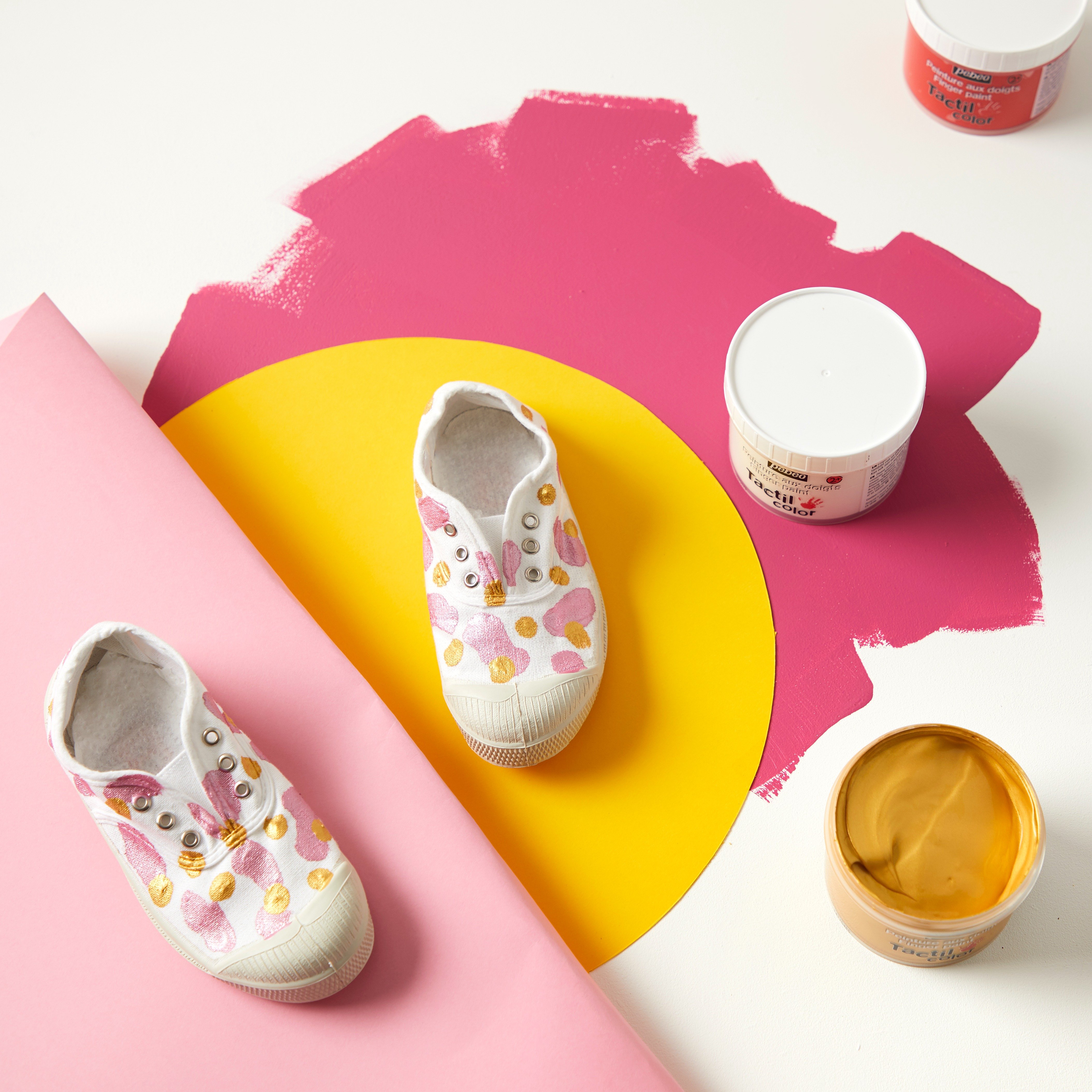 Обмакни палец в розовую краску и нарисуй продолговатые полосы, проводя пальцем по каждому кроссовку. Нужно дать краске высохнуть примерно 30 минут.