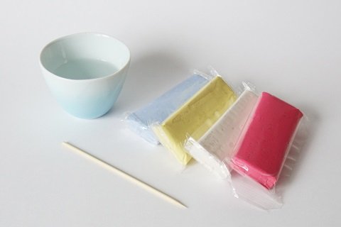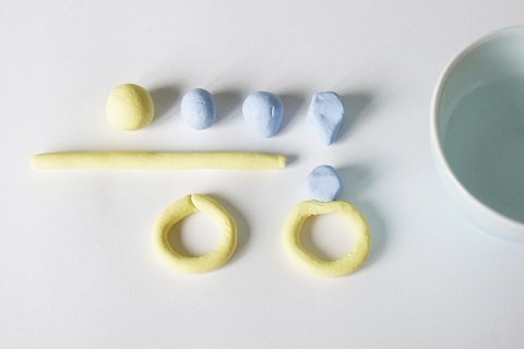 Чтобы вылепить «колечко» из мела, скатай из желтой массы тонкую колбаску и согни её в кольцо по размеру пальца. Немного смочи концы колбаски, чтобы их склеить. Скатай маленький шарик из синей массы, сожми нижнюю часть пальцами, чтобы получилось что-то вроде юлы. Постукивая по столу с разных сторон, ограни его как алмаз. Немного смочив водой, приклей алмаз к верхней части кольца.