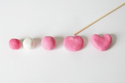 Чтобы вылепить «сердечко» из мела, смешай шарики из белой и красной массы. Получится розовый шарик. Примни шарик ладонью, чтобы получился диск. Зубочисткой отметь углубление в верхней части диска, а затем пальцами вылепи сердечко.