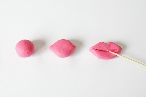 Чтобы вылепить мелок «поцелуй», нужно расплющить ладонью шарик красной массы, чтобы получился диск. Прижми пальцами с противоположных сторон диска, чтобы сформировать уголки губ. Наметь зубочисткой центральную впадину верхней губы и проведи горизонтальное разделение между губами.