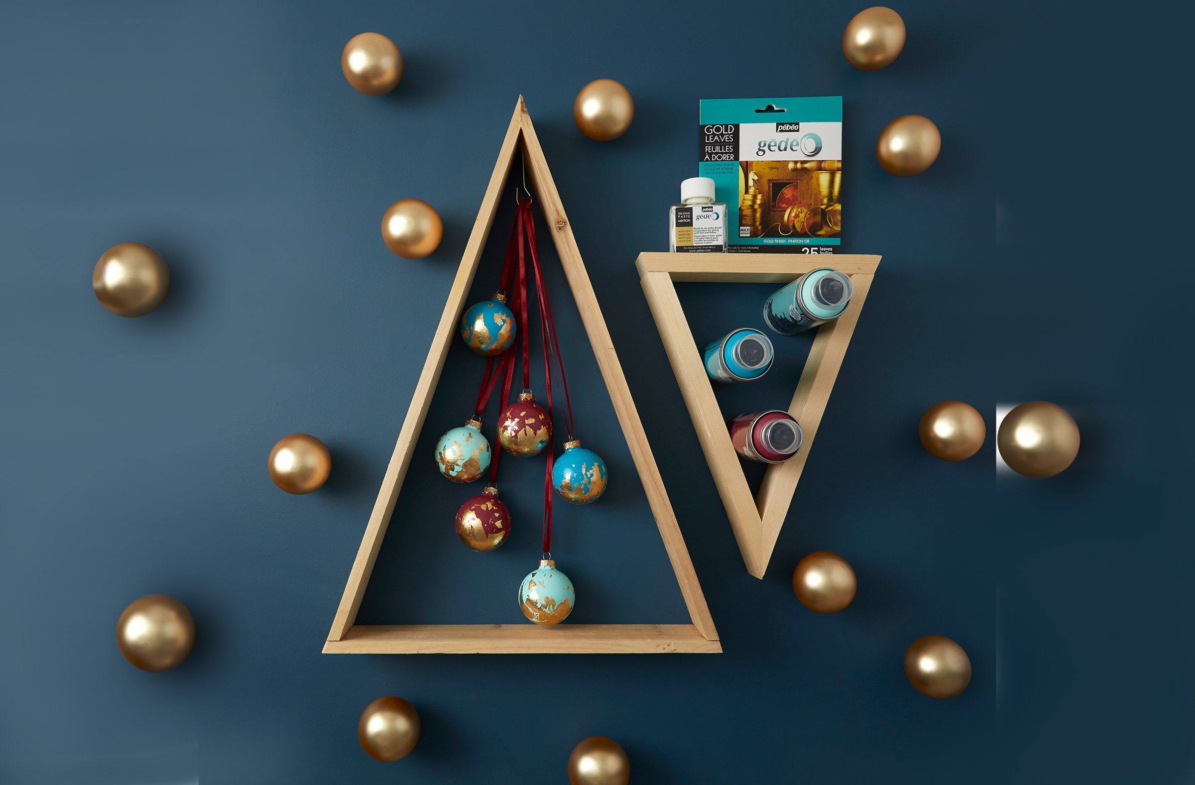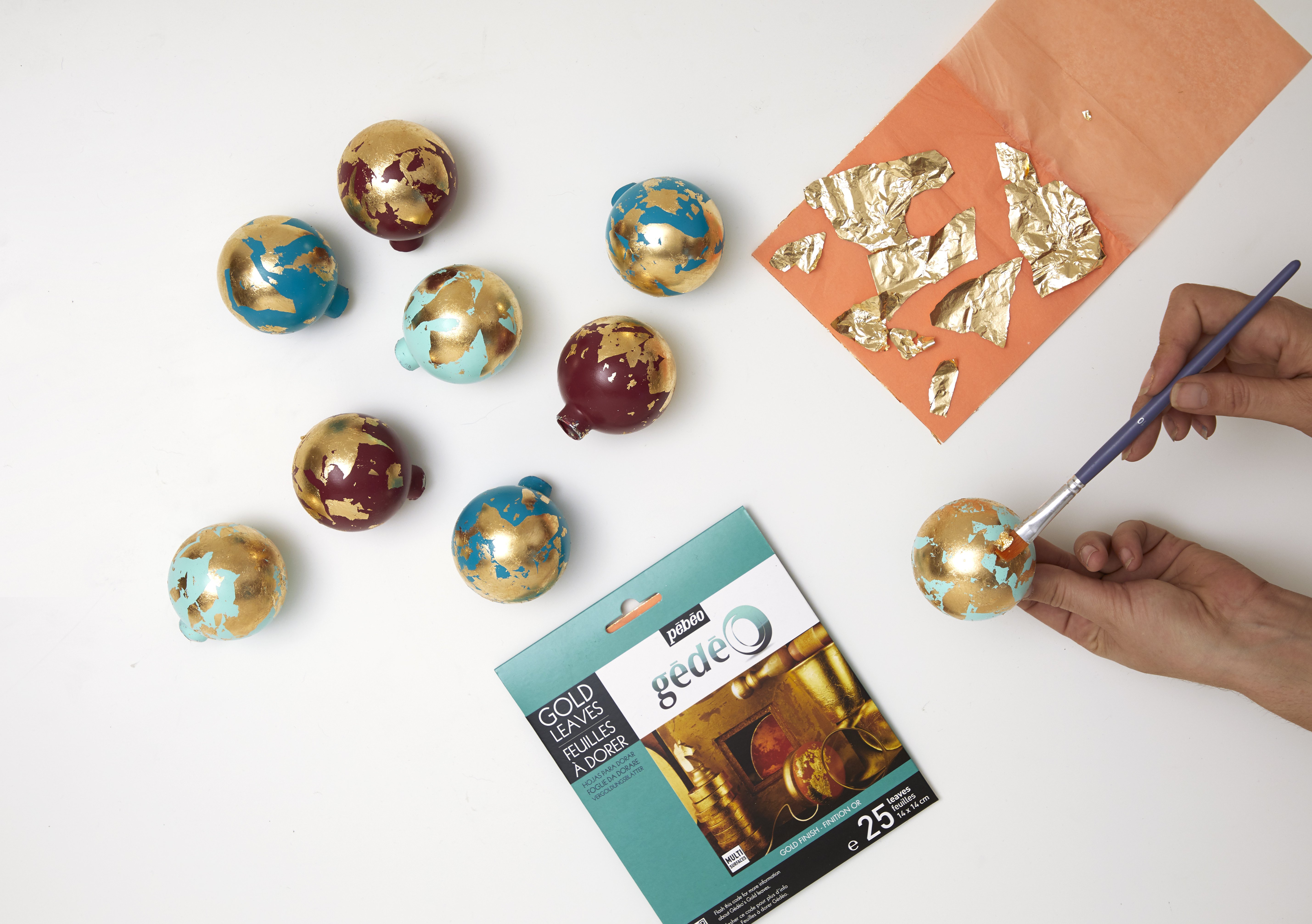 - Пригладьте листья фольги плоской кистью на каждый шарик. Начните от основания, обильно покрывая, двигайтесь вверх по направлению к креплению шара. Время высыхания 2 часа