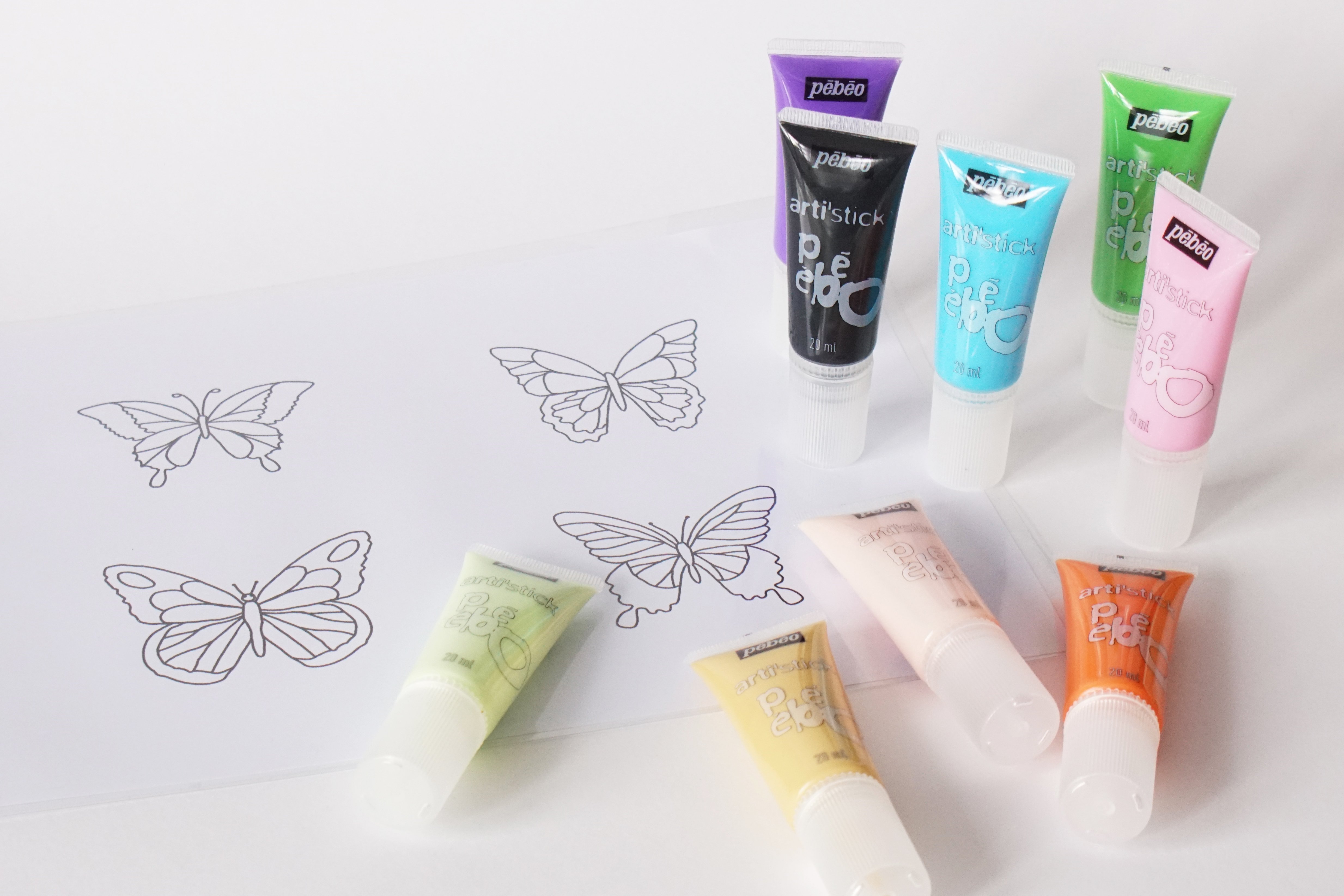 - Раскрасьте крылышки бабочек тюбиками arti’stick разных цветов.