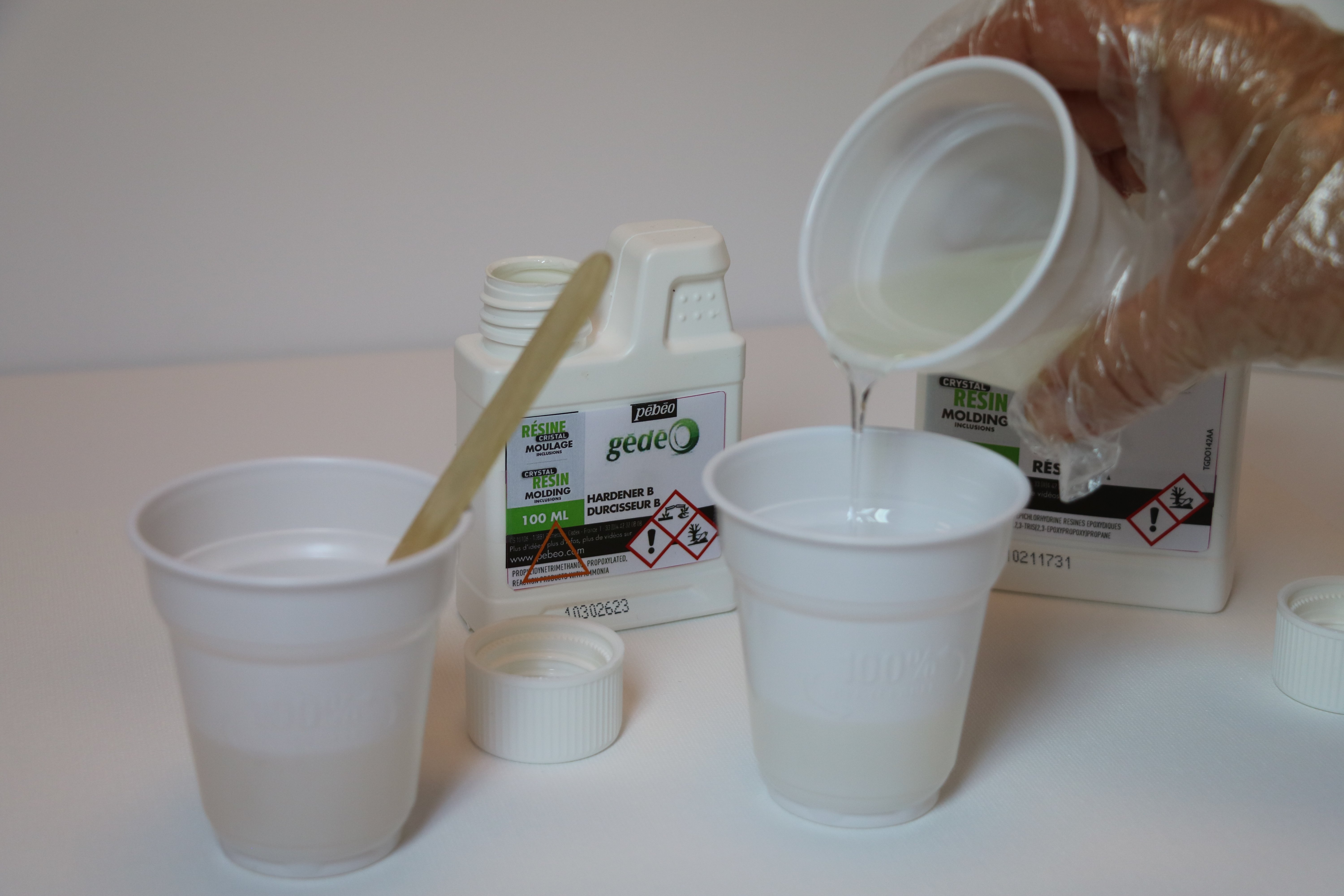 Распределите смолу по 3-ём стаканчикам в следующей пропорции: