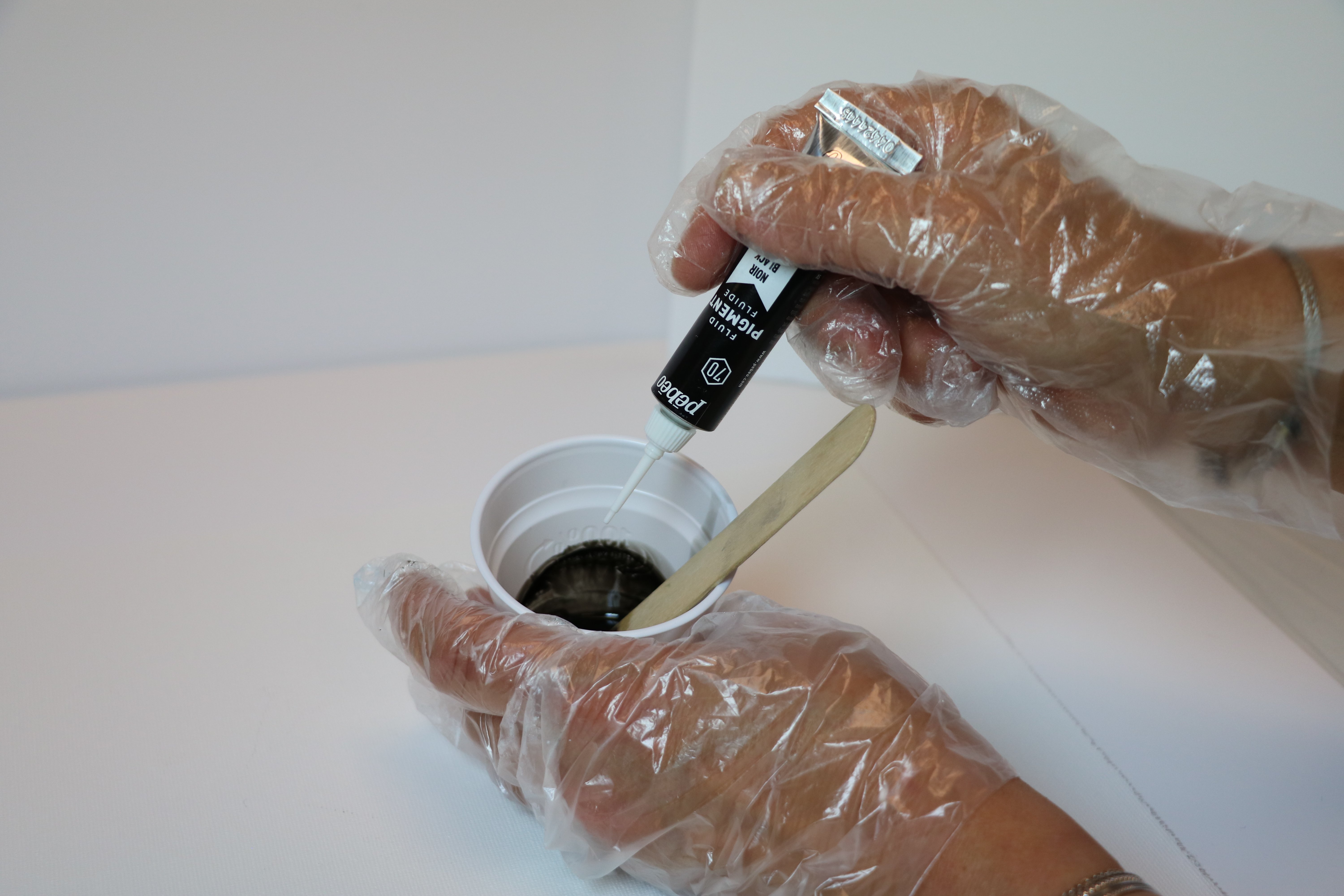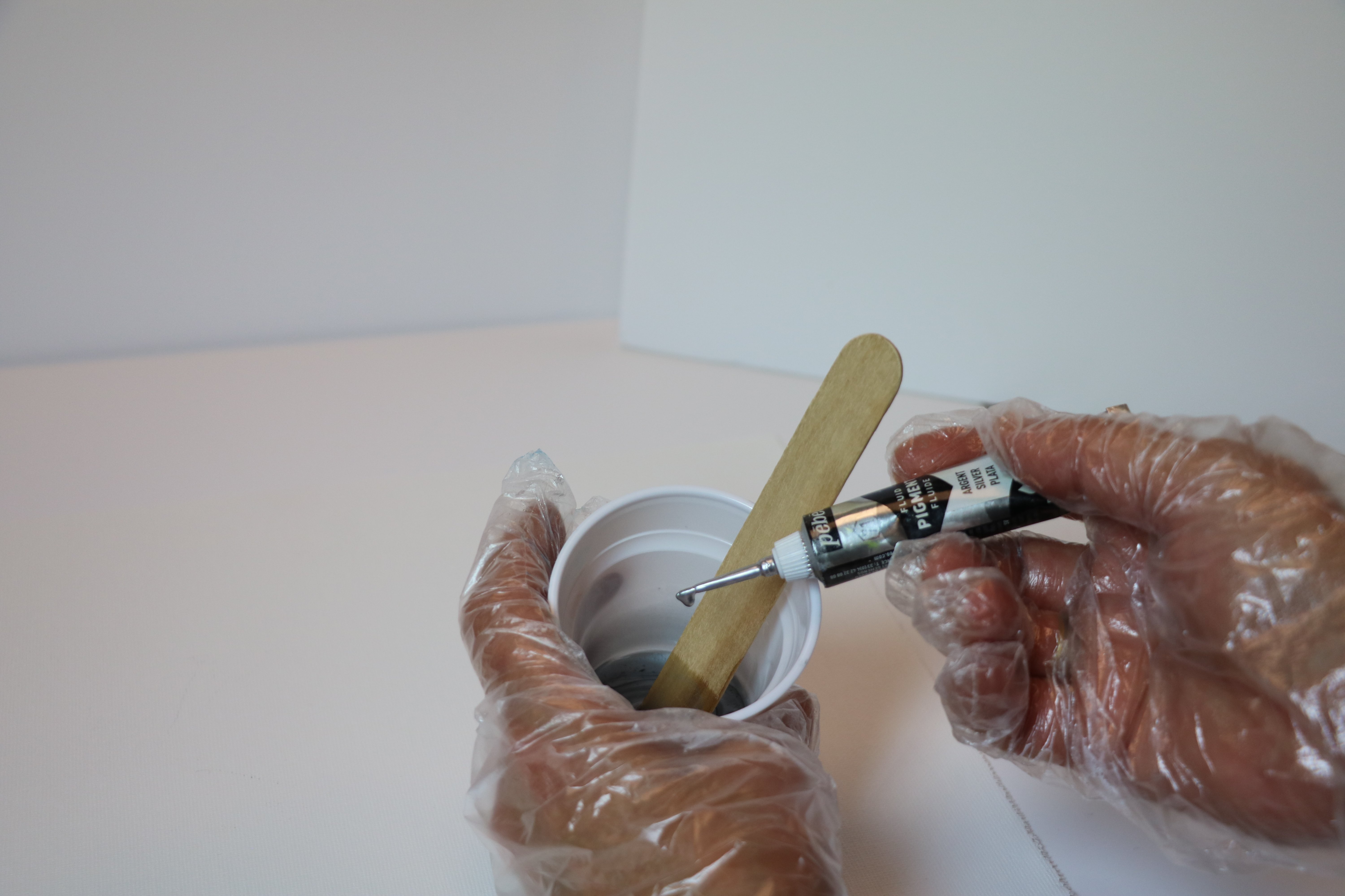 В 1 стаканчик налейте 10% смеси, добавьте примерно десять капель жидкого серебряного пигмента. Перемешайте.
