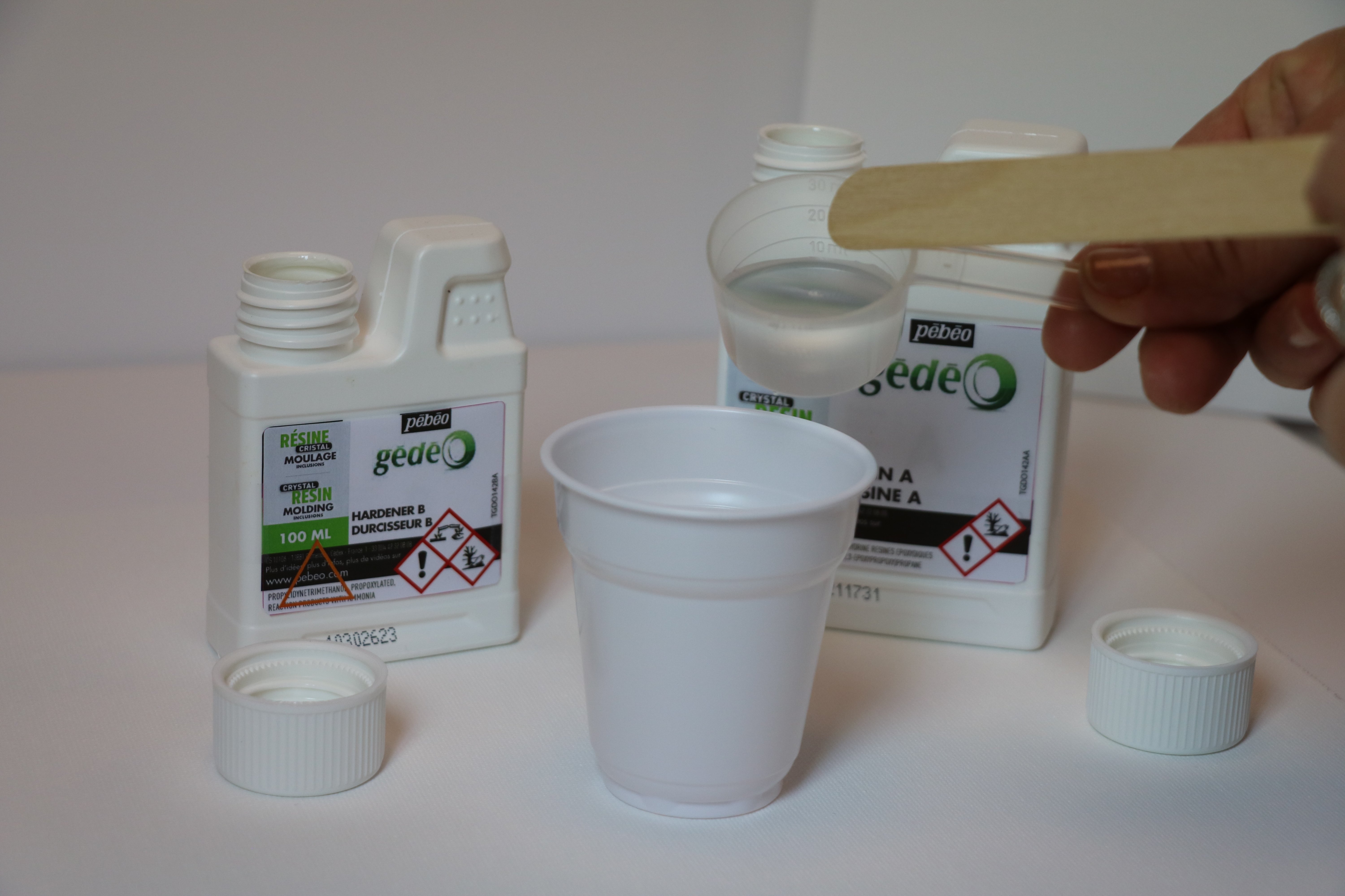Налейте в стаканчик 2 полные мерки смолы “А”