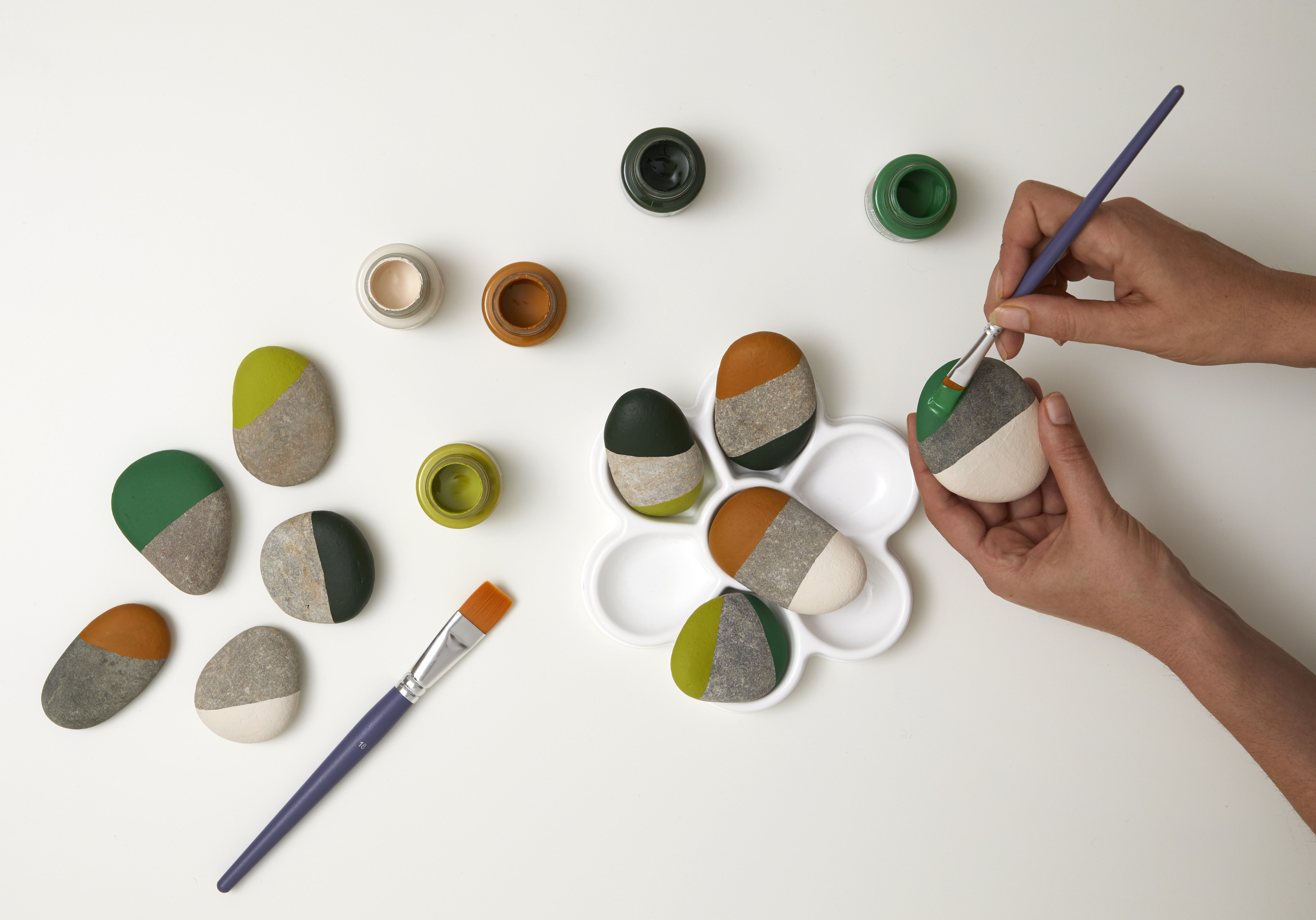 - Для каждого цвета выберете по 2 камешка и закрасьте небольшую часть с одного конца. Дайте высохнуть в течение 30 мин