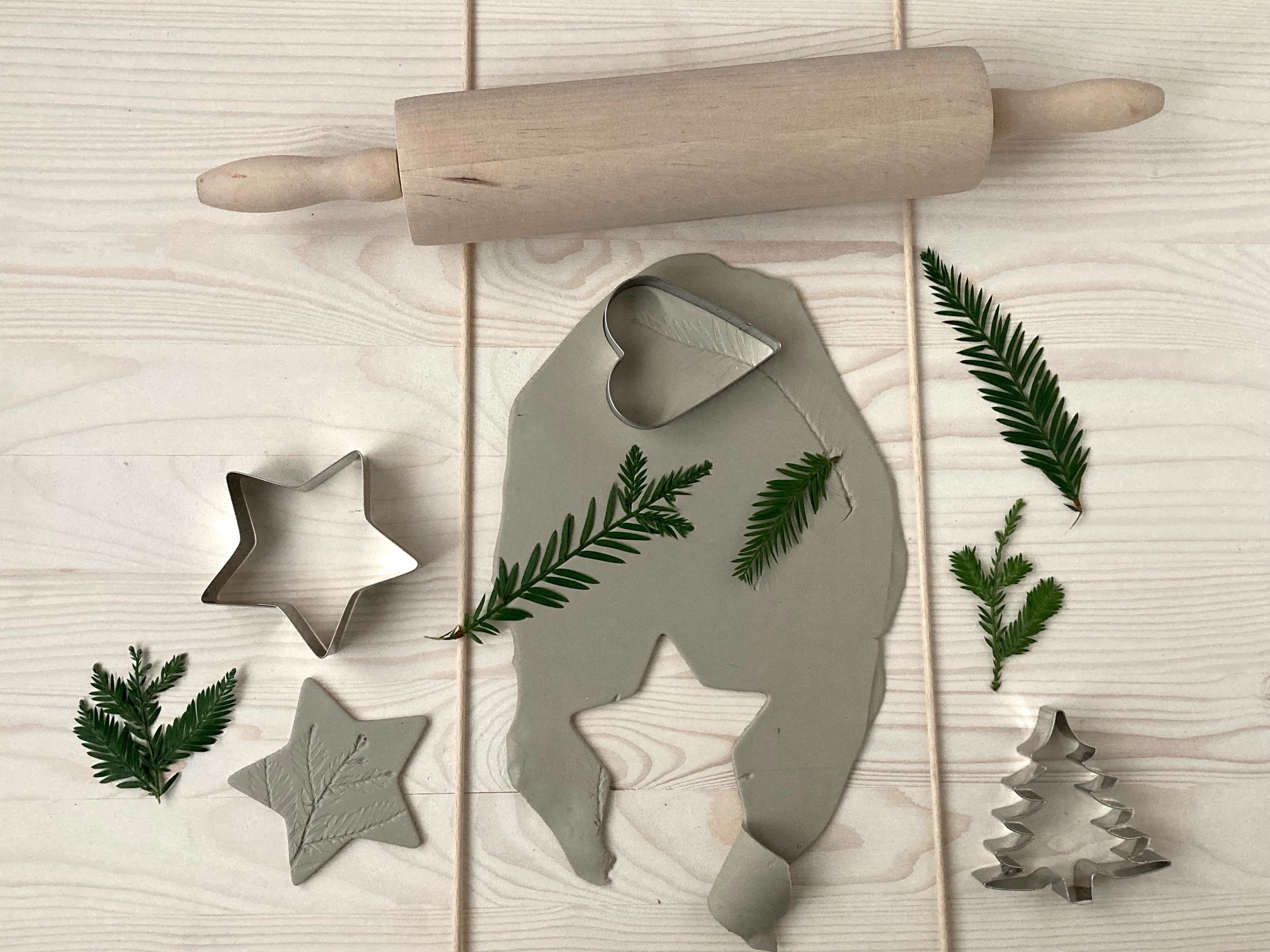 - Формочки для печенья,Веточки хвойных деревьев, Скалка и 2 длинных палочки диаметром 5мм, Тонкая острая палочка или зубочистка (для отверстий)