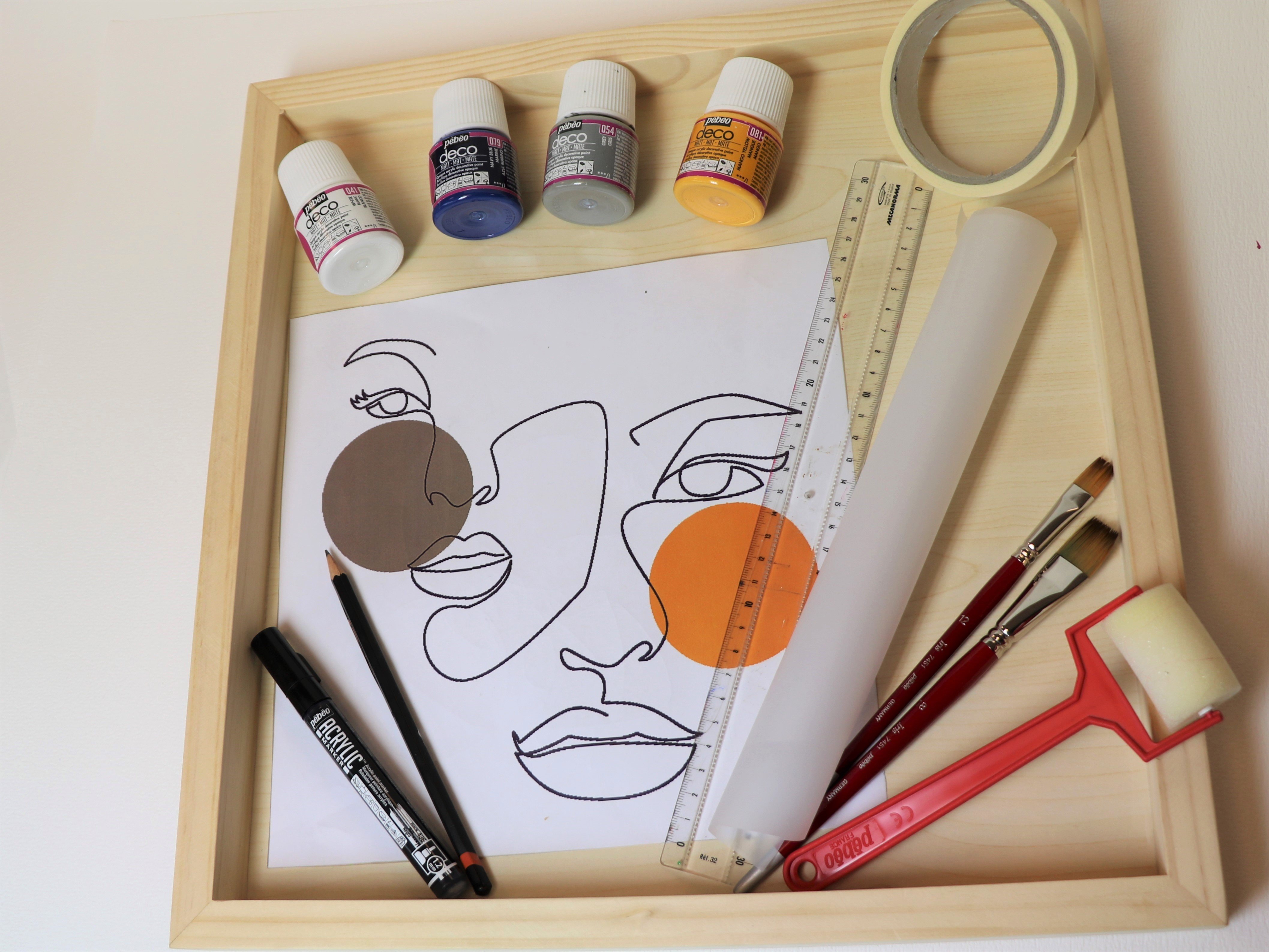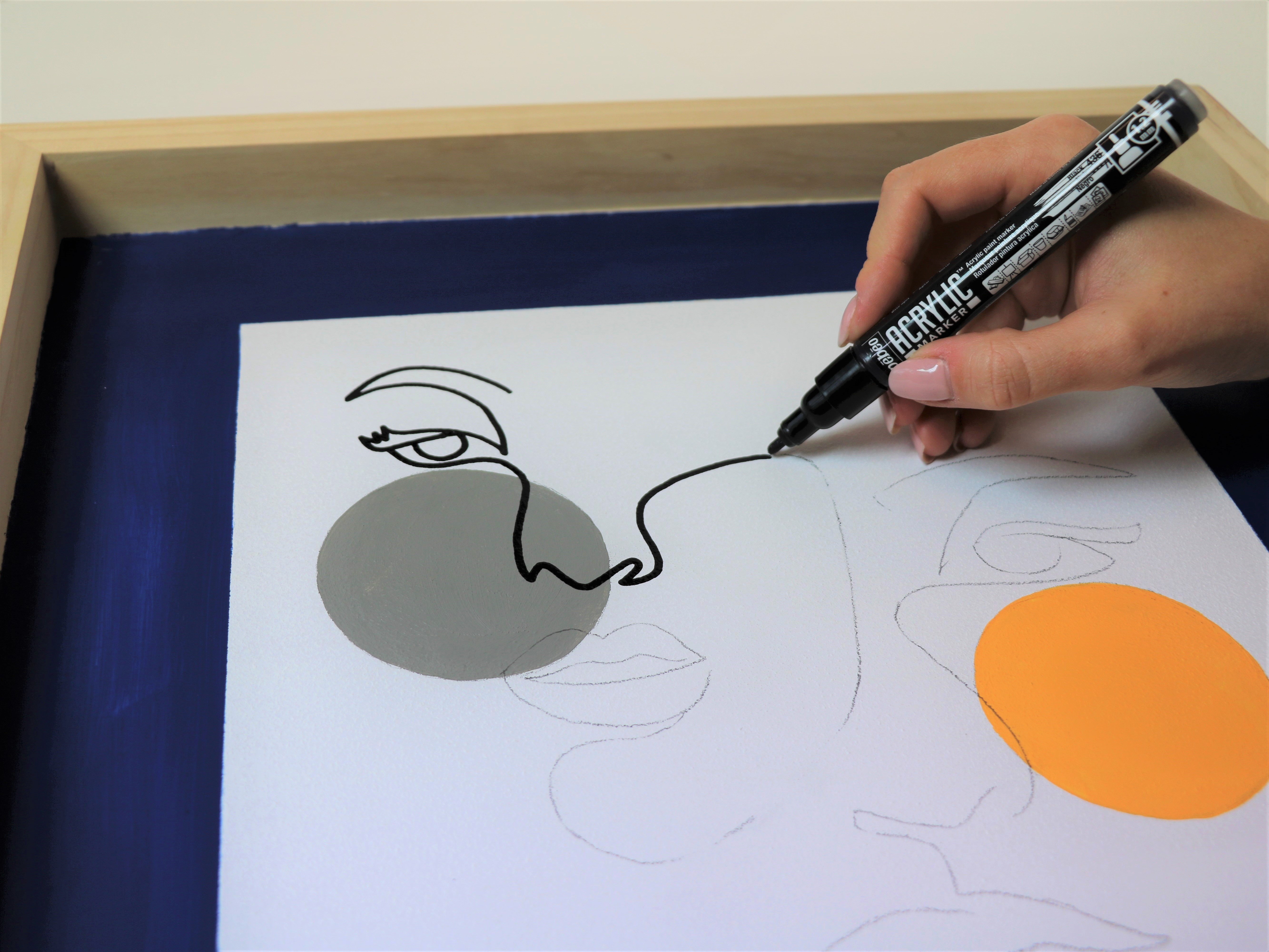 - Затем перенесите изображения лиц. Прорисуйте линии черным акриловым маркером.
