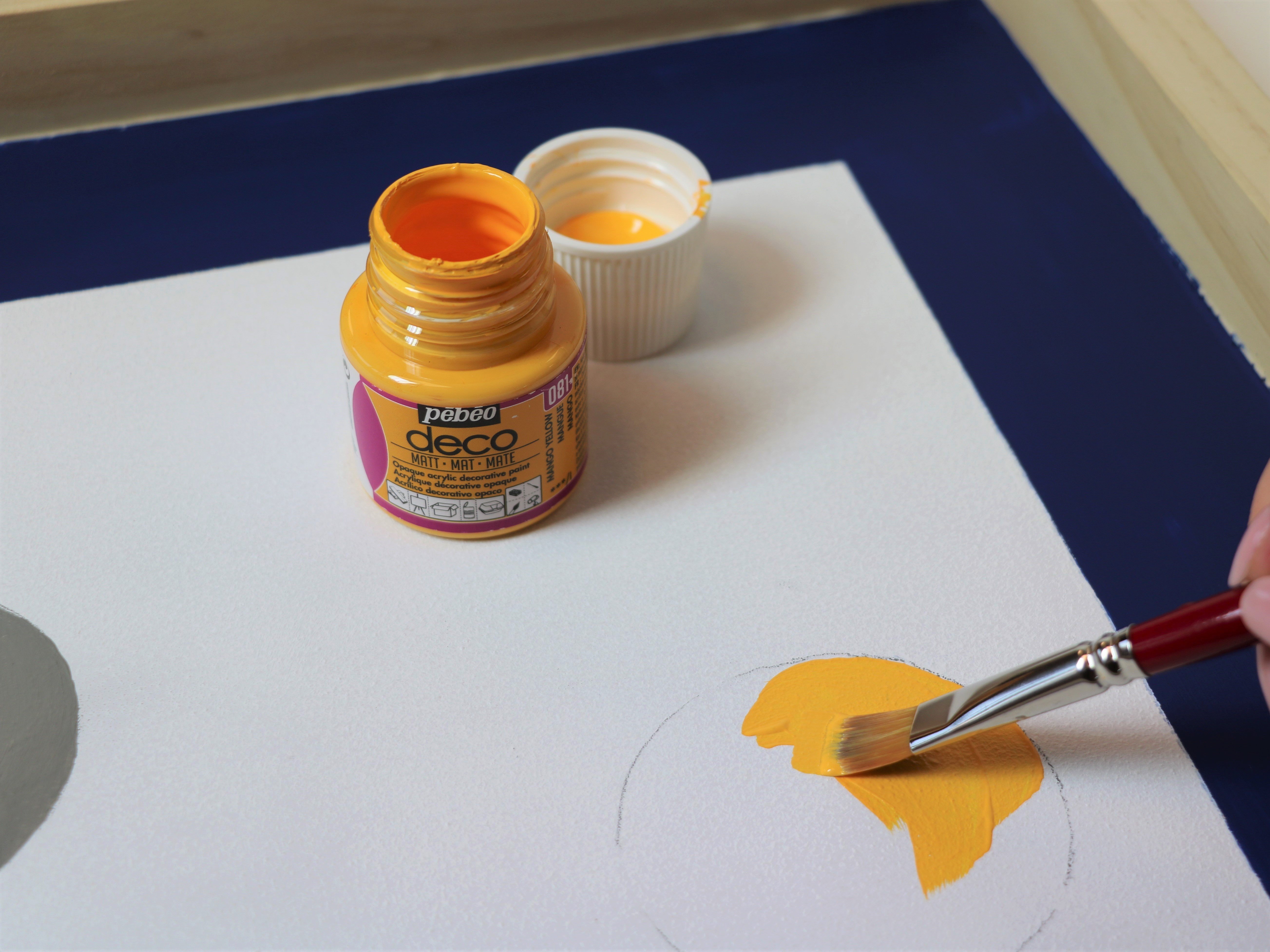 - Кистью Iris № 8 закрасьте внутренний контур одного круга серым. Затем перейдите к жёлтому. Оставьте на 1 час, чтобы краска высохла.