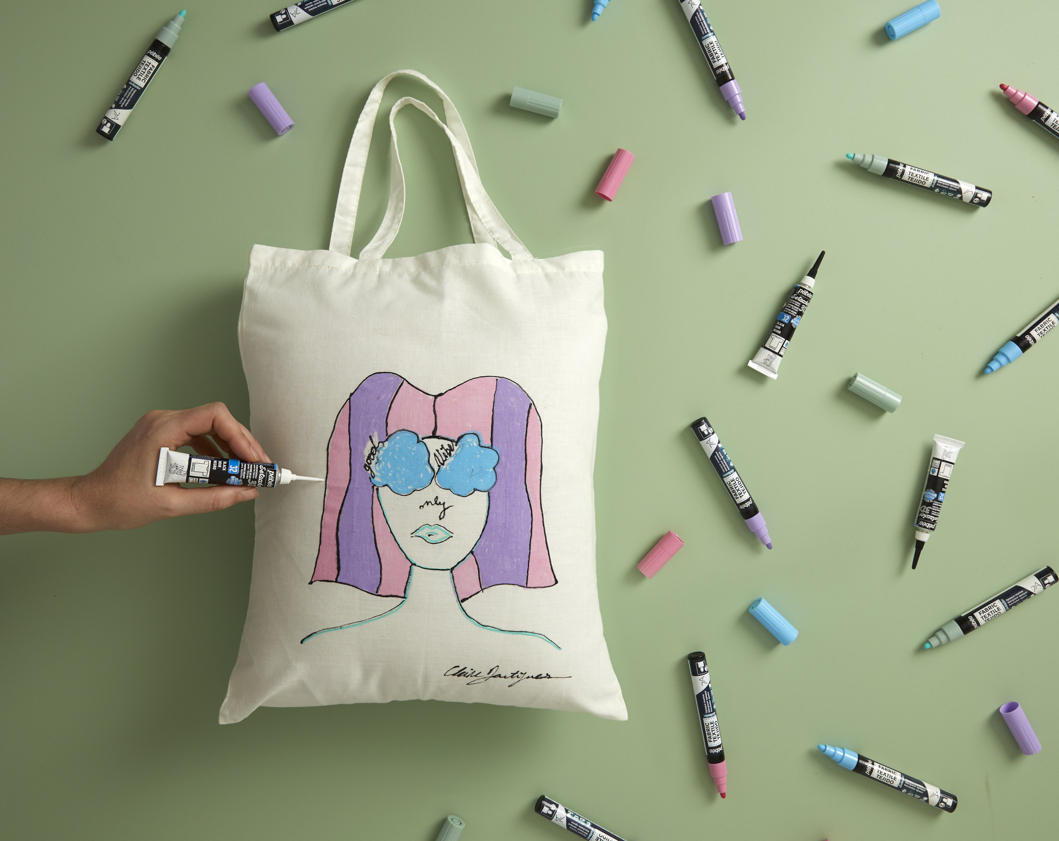 - Чтобы раскрасить внутреннюю часть фигур эскиза, используйте маркеры для ткани Pebeo 7A.