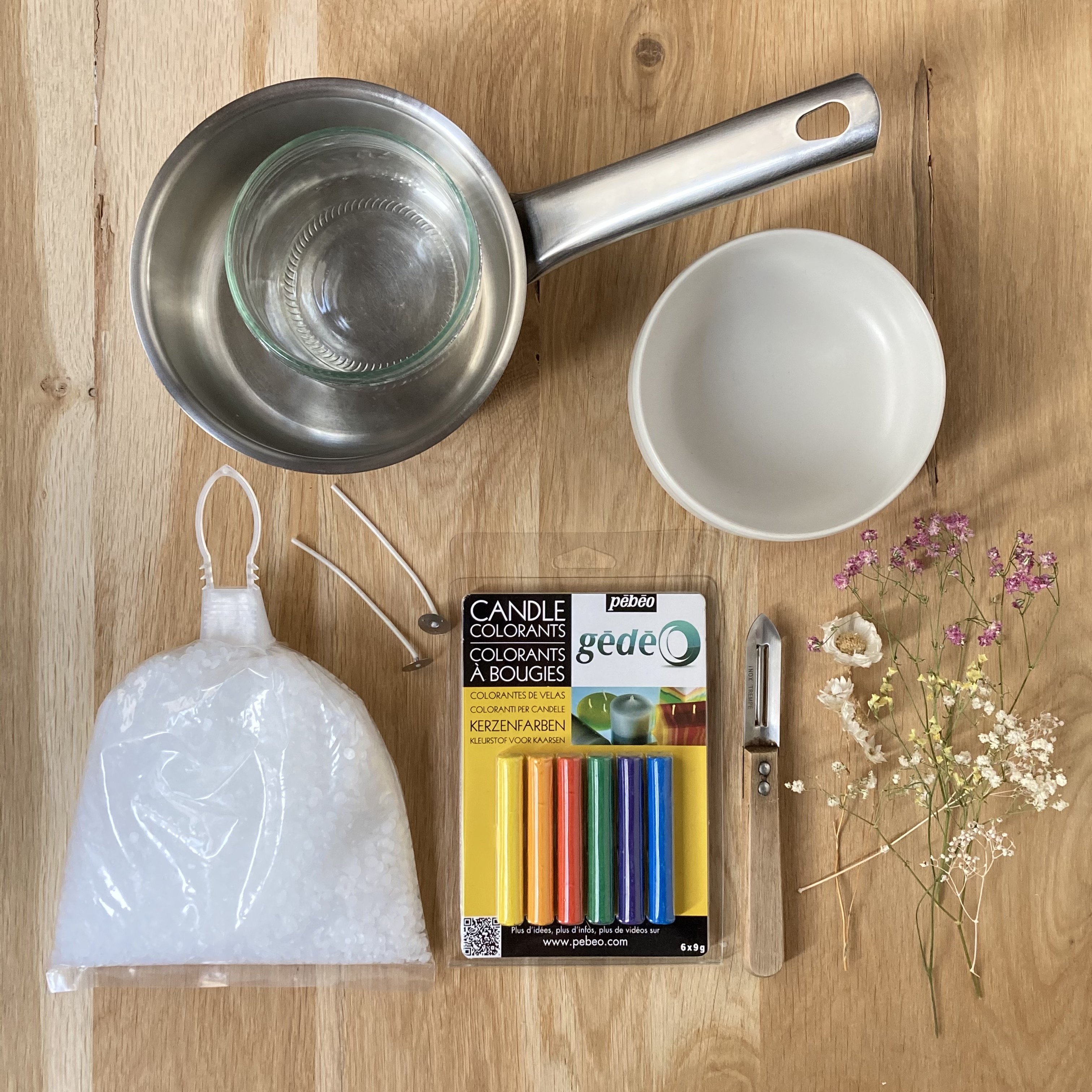 - Быстро обмакните металлическую пластинку фитиля в расплавленный воск и приклейте её ко дну формы.