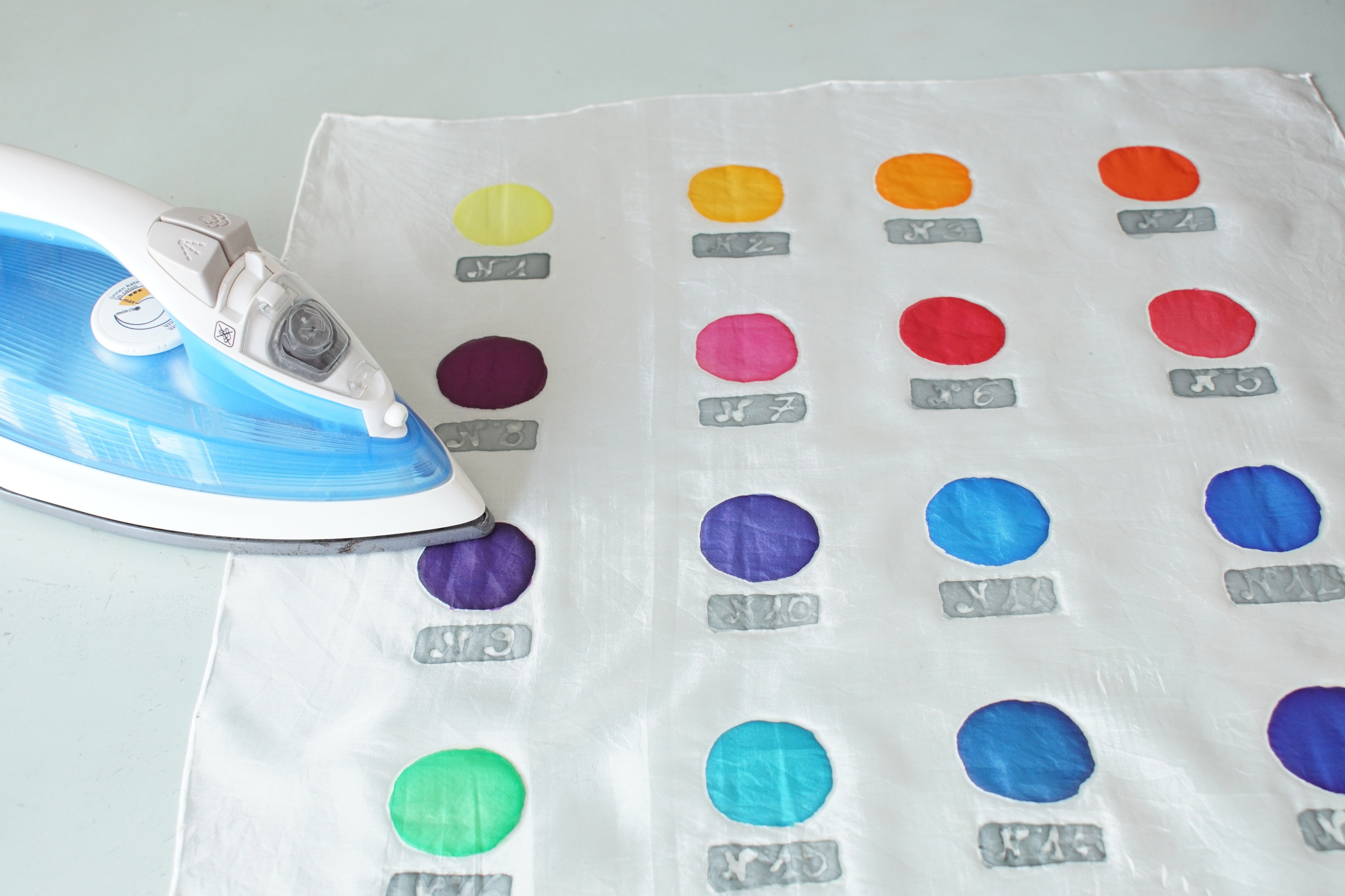 Дайте краске высохнуть в течение 30 минут, а затем прогладьте утюгом с изнанки в течение 5 минут, установив термостат в положение “хлопок” без отпаривания, чтобы зафиксировать рисунок.