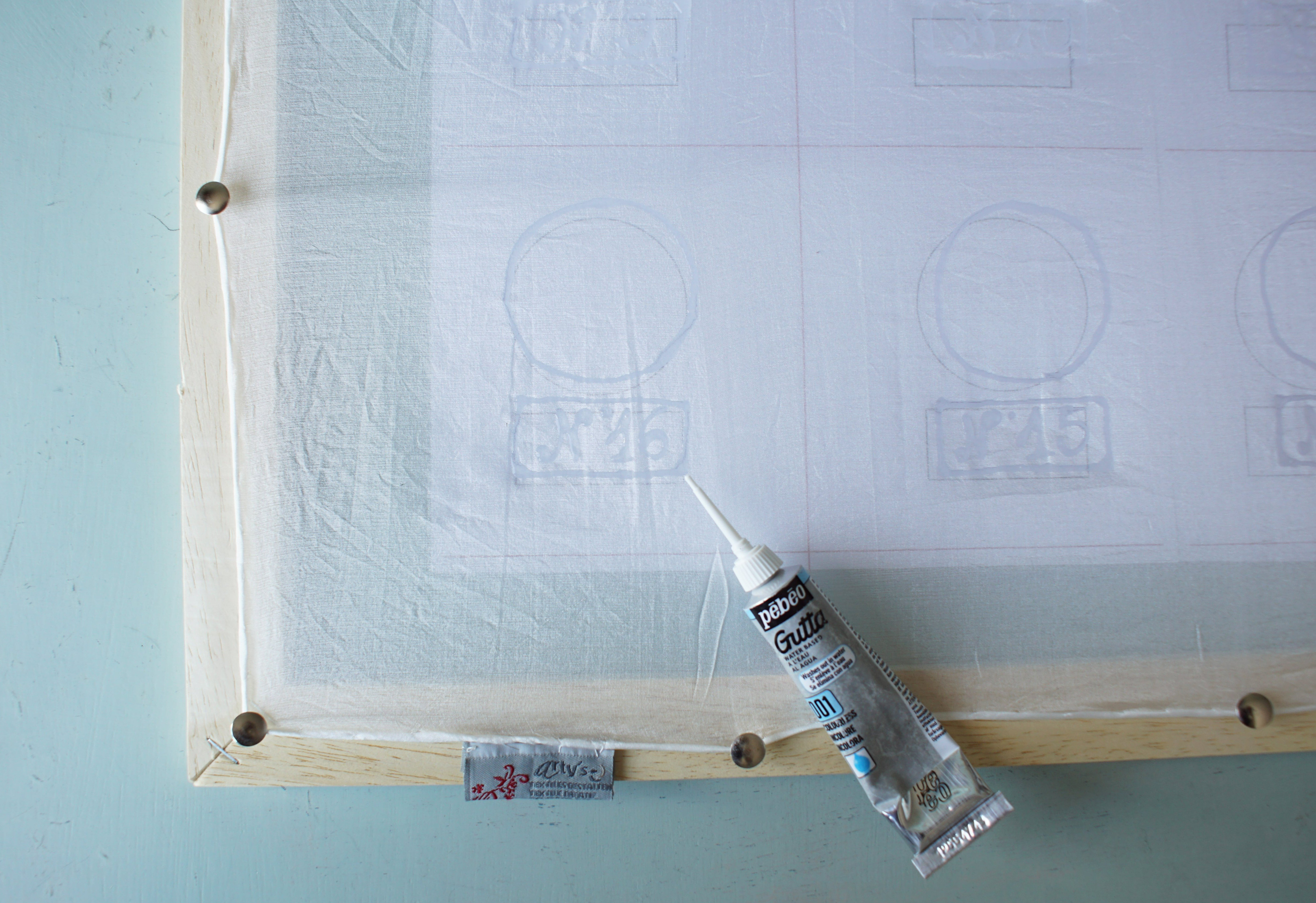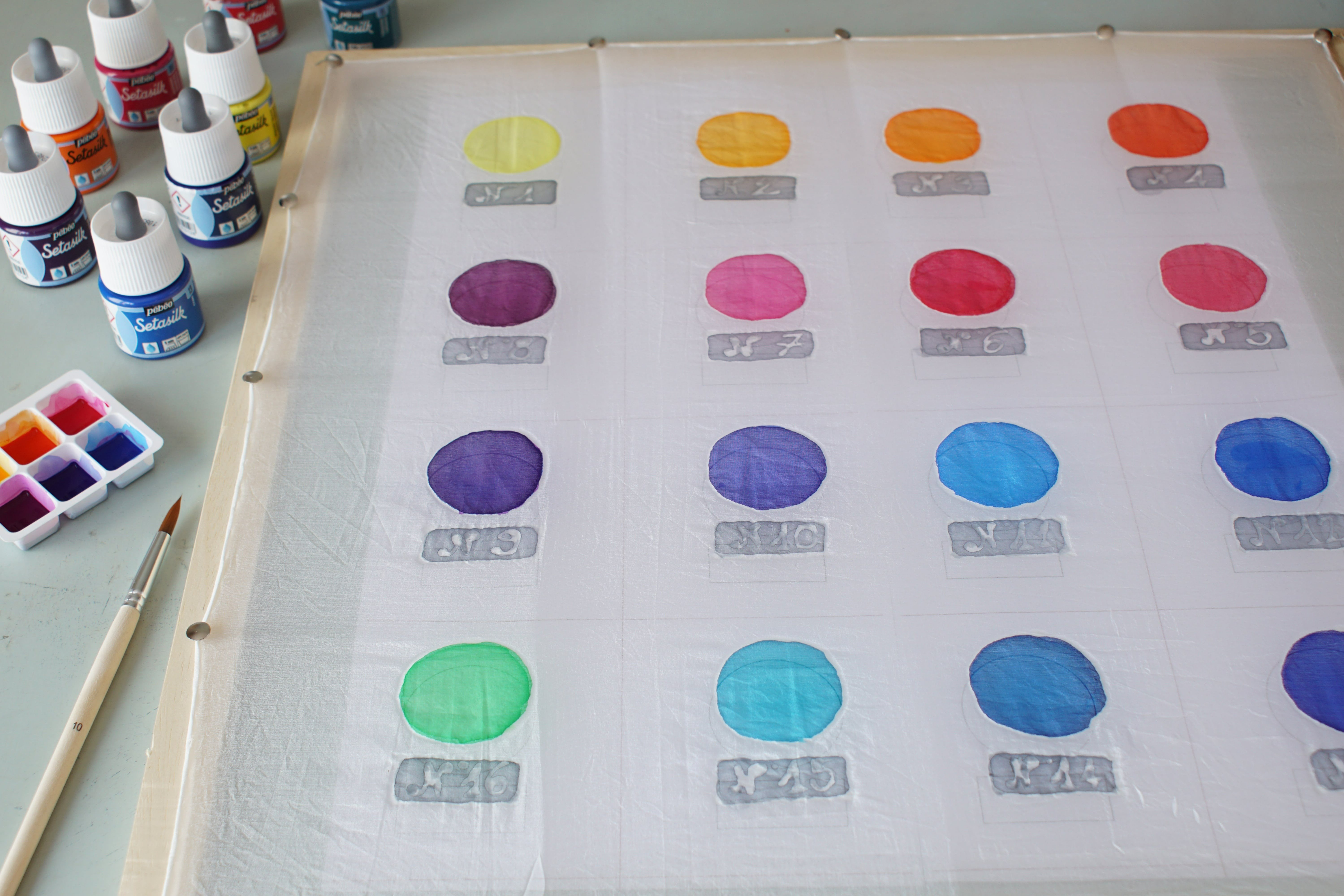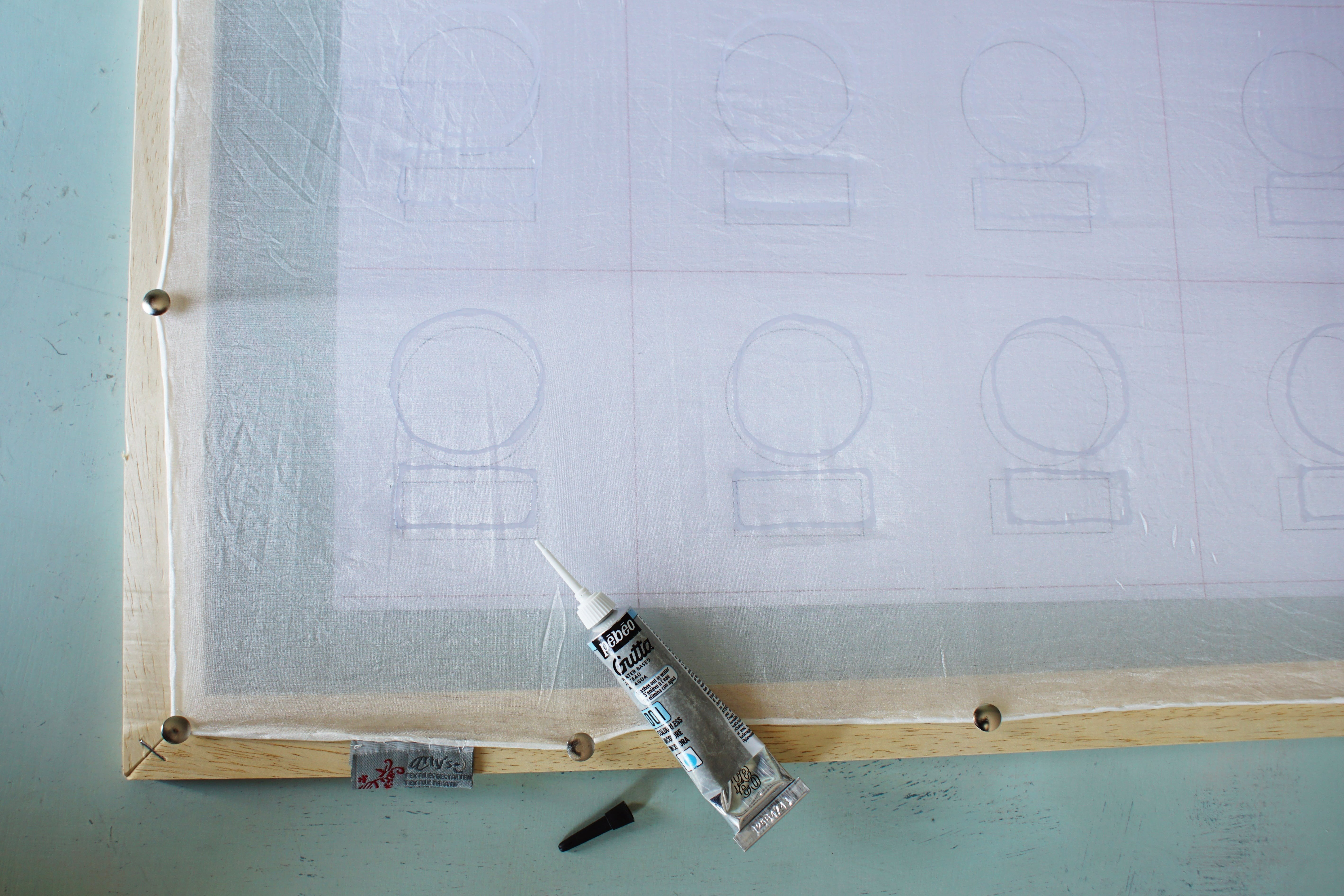 Поместите выкройки под шелковый шарф и наведите круги и этикетки бесцветным контуром гутта (gutta) из набора Sétacolor.