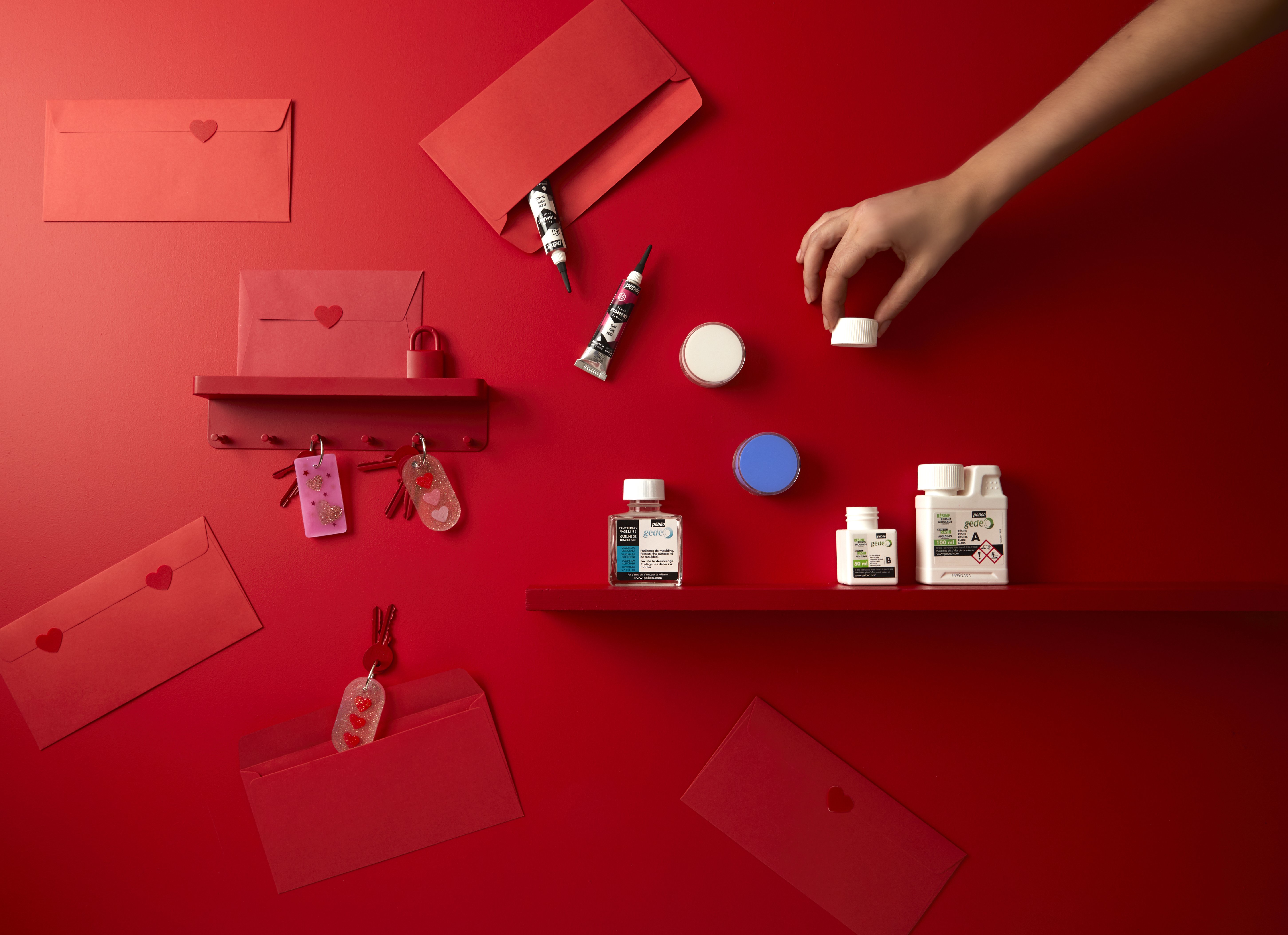 - Quand la résine est devenue sirupeuse et collante mais pas encore prise, déposez délicatement à la surface petits cœurs et étoiles.