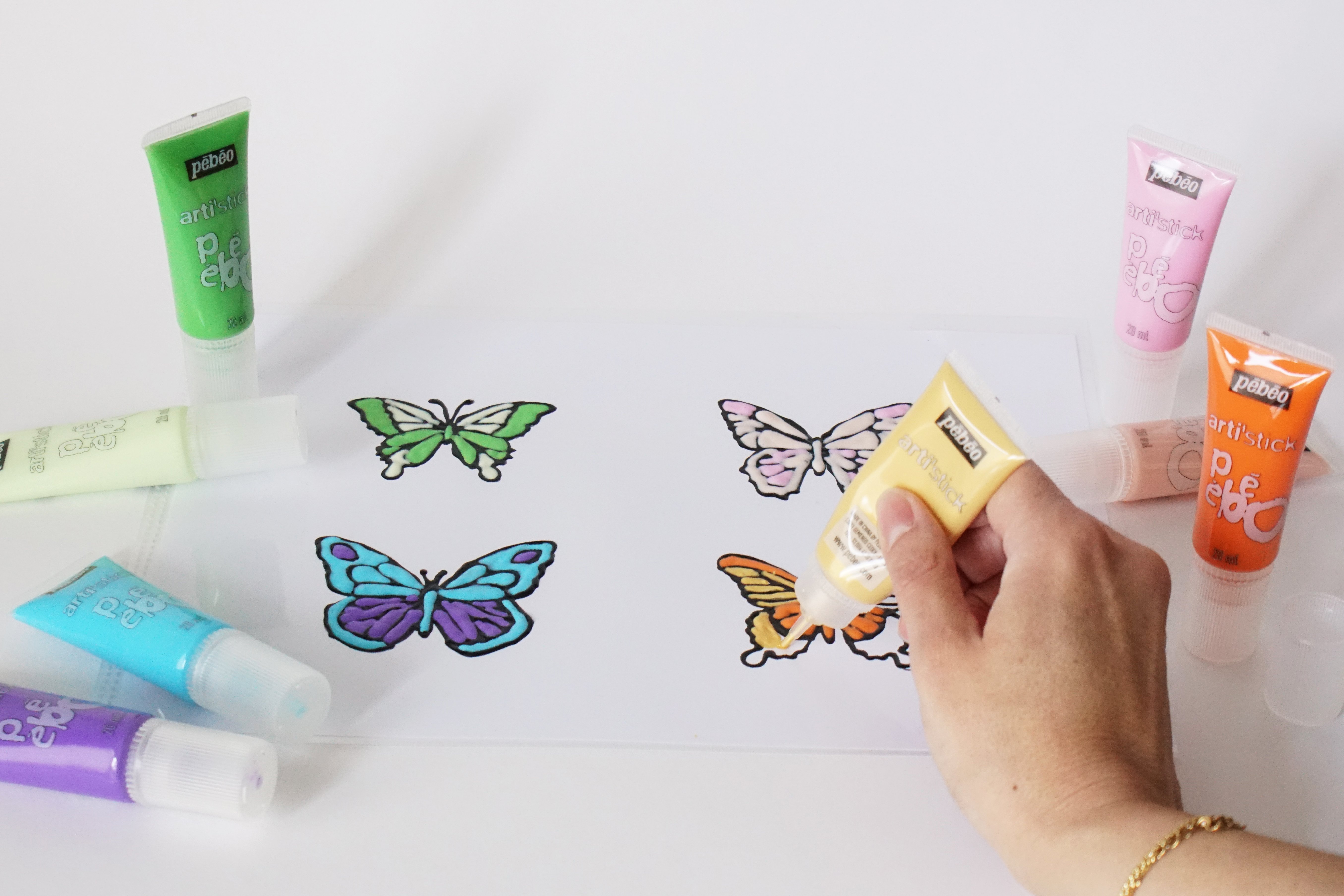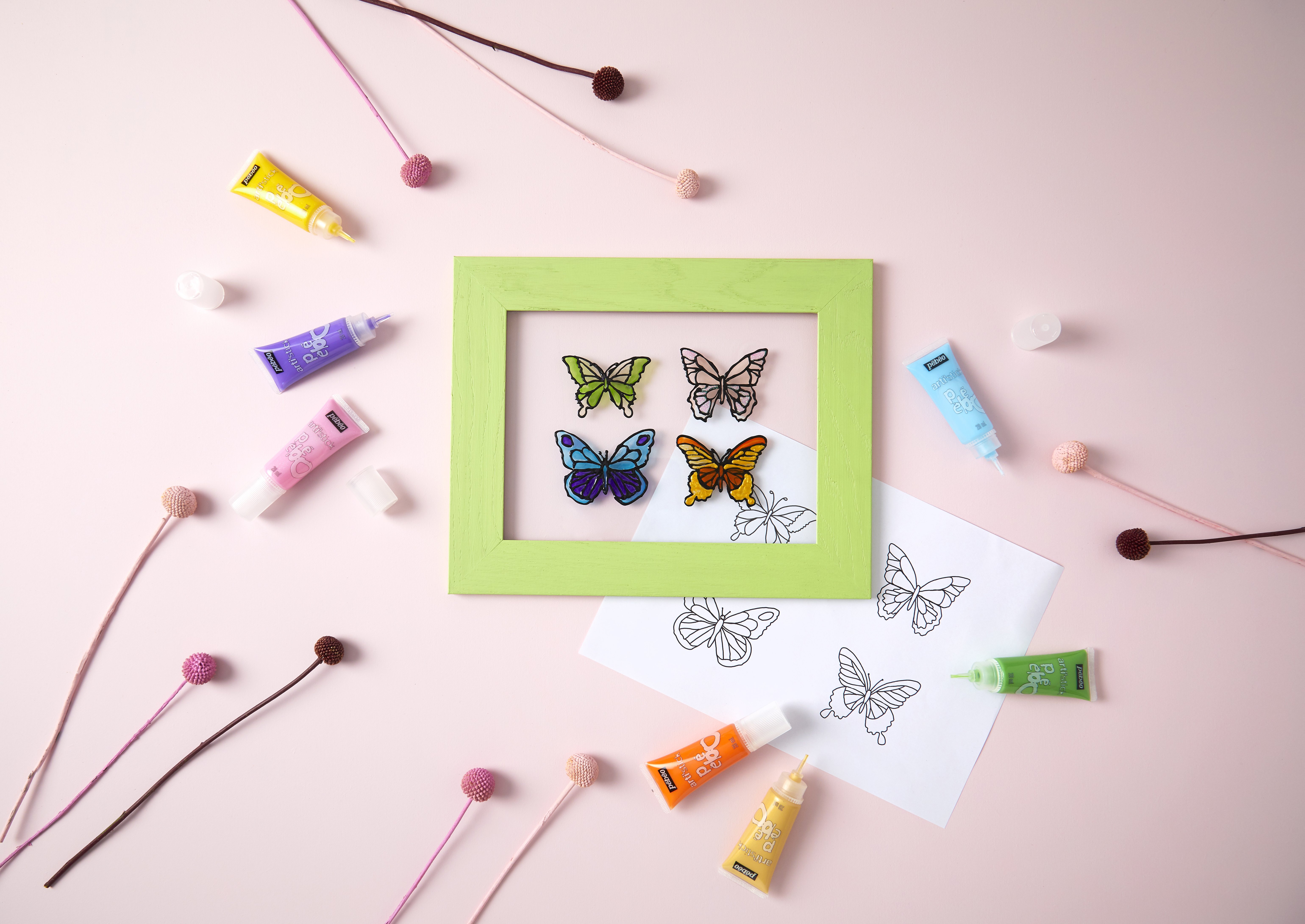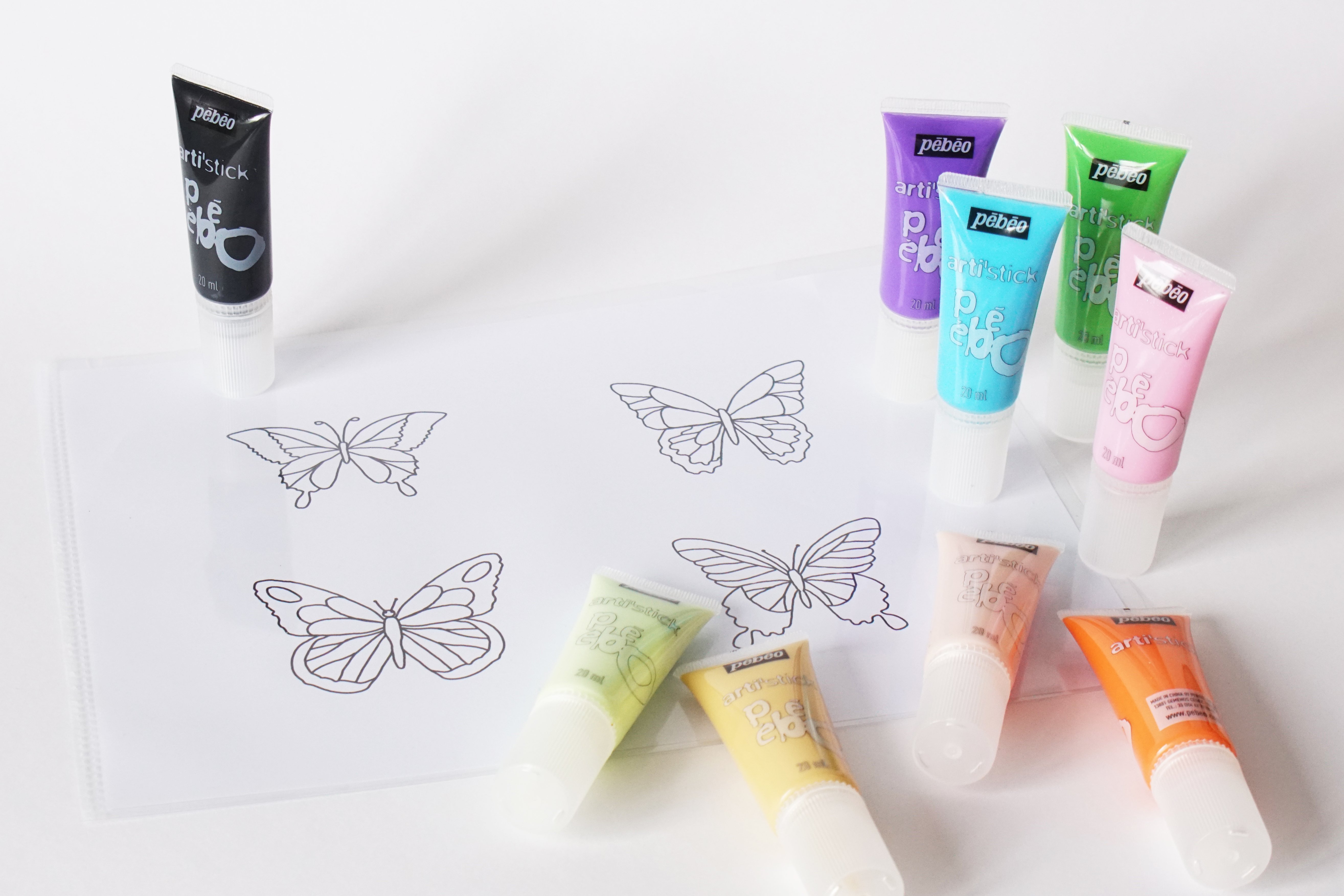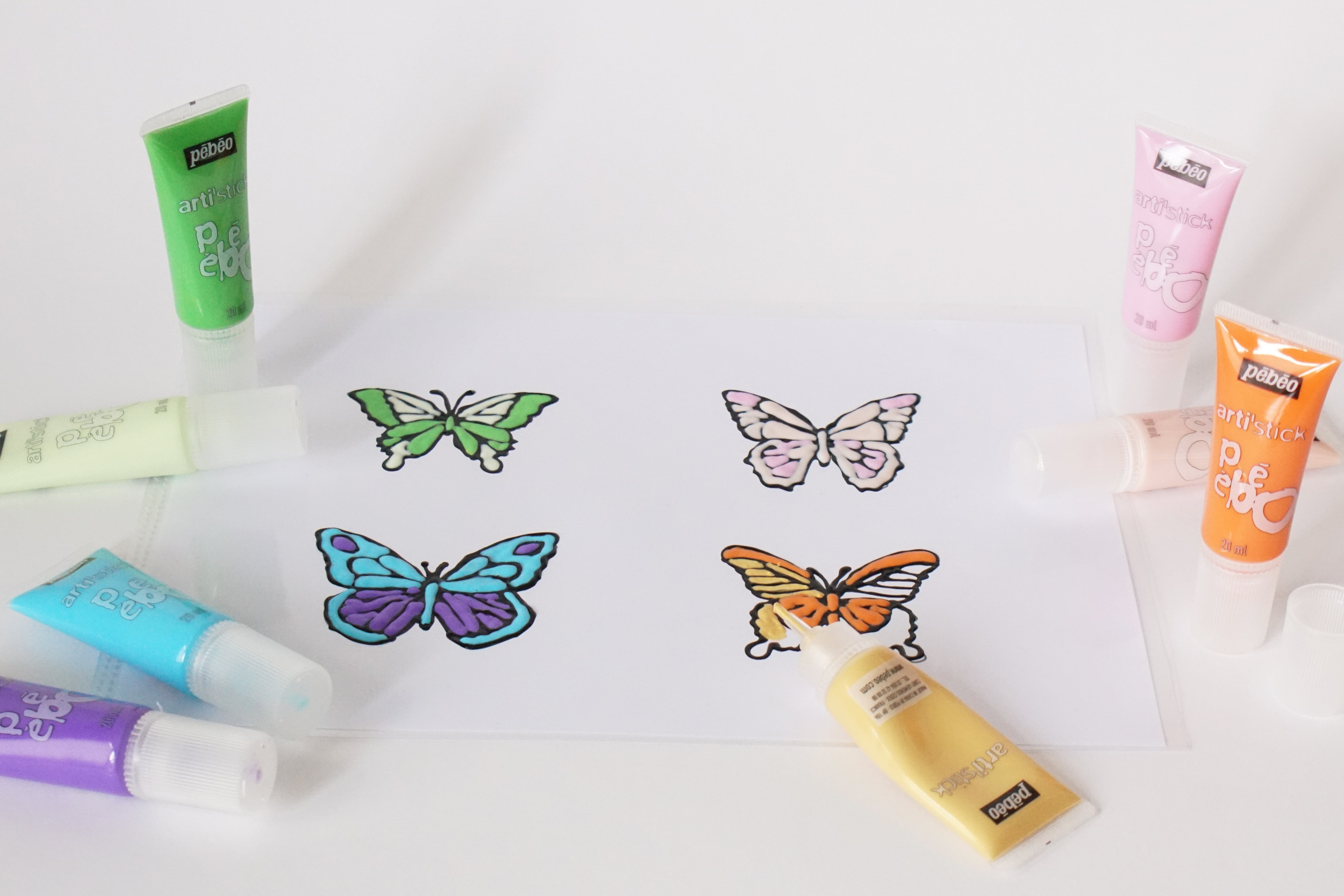 - Colorie l’intérieur des ailes de papillons avec des tubes arti’stick de différentes couleurs.