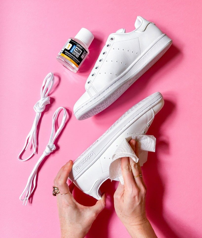 - Utilisez votre dégraissant pour préparer votre support. Enlevez les lacets si vous souhaitez faire un design « motif » . Versez un peu de dégraissant sur un papier propre.