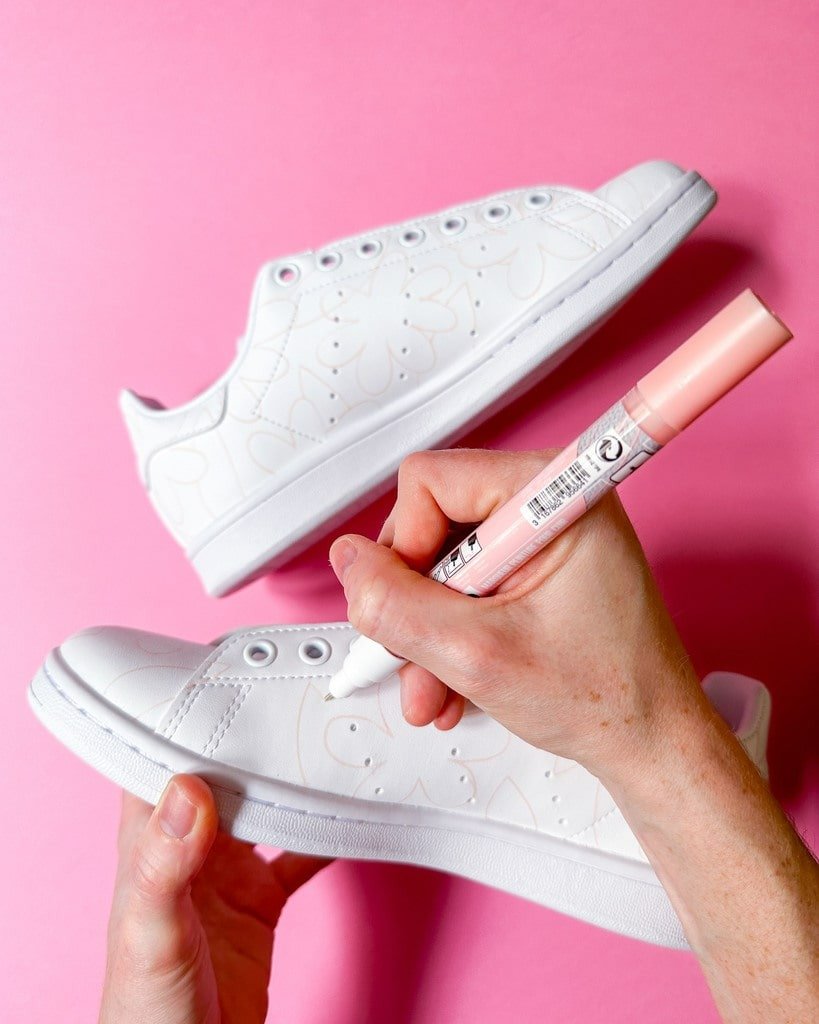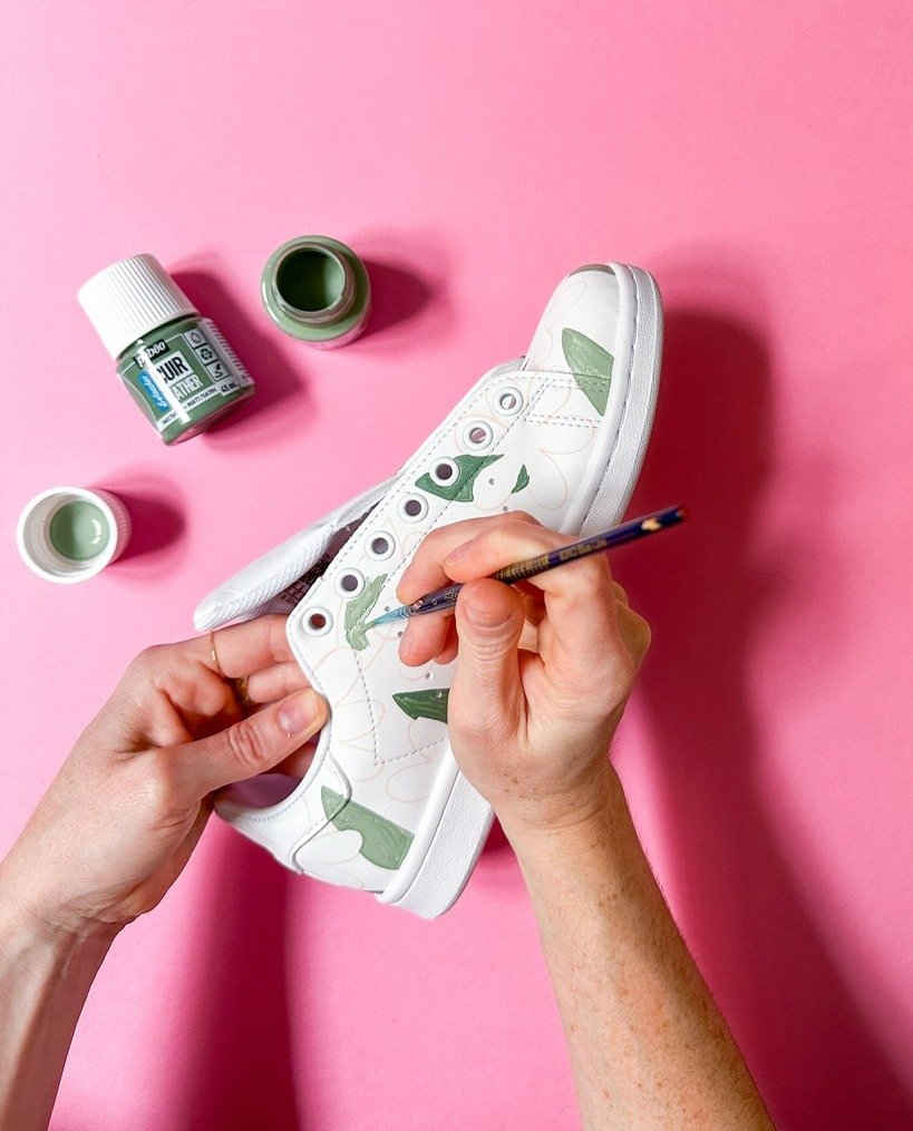 - Avec un marqueur SETACOLOR Cuir, dessinez sur vos chaussures les contours des formes à peindre.