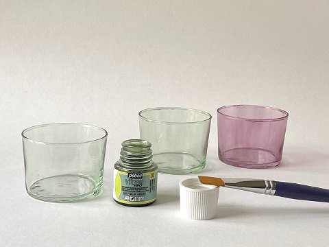 - Avec le pinceau plat peignez une couche de couleur en rose et vert sur les verrines pour les colorer légèrement. Laisser sécher.