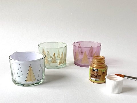 - Positionnez-le à l’intérieur et peignez les sapins à petits coups de pinceaux avec le coloris or.