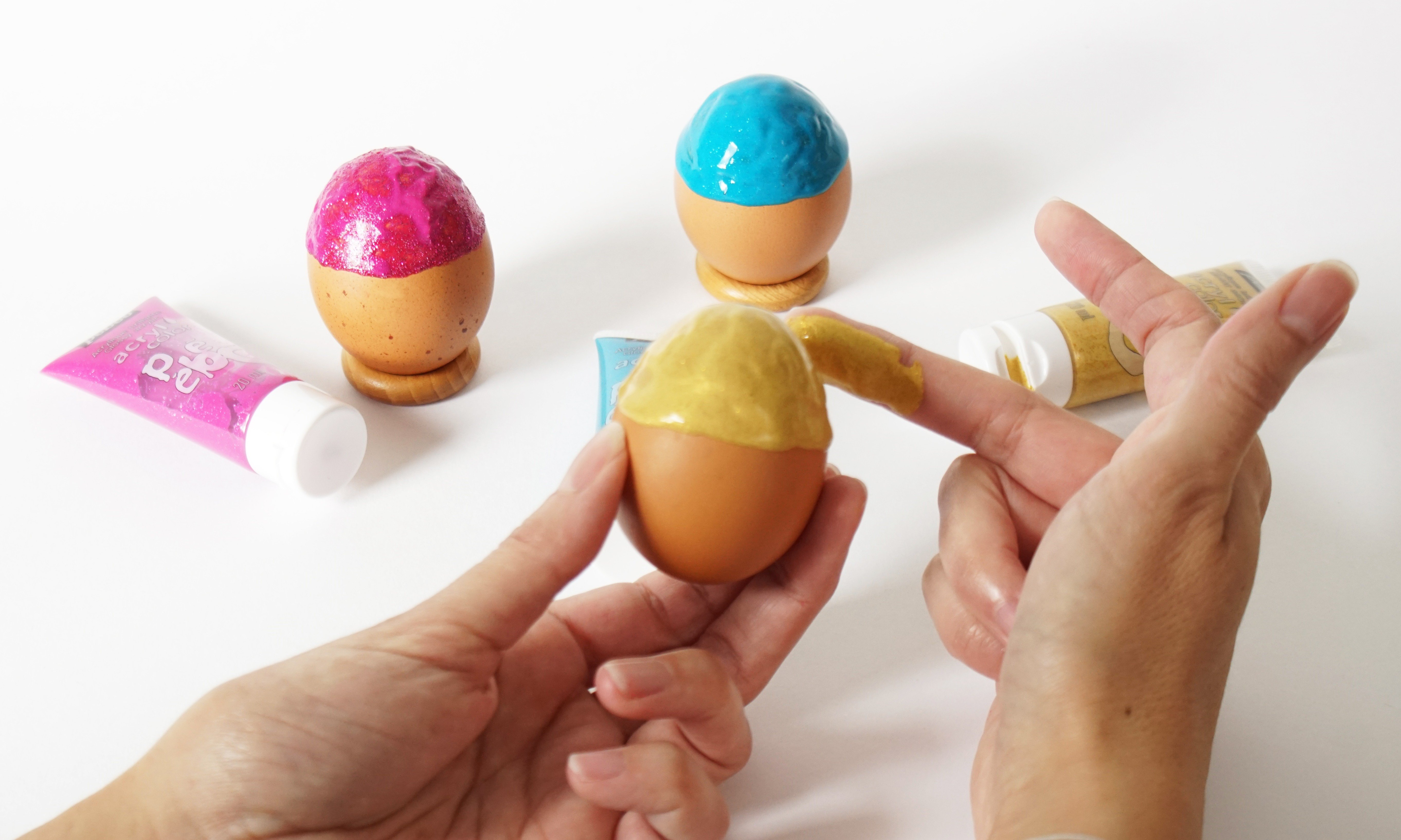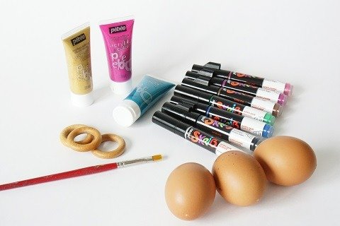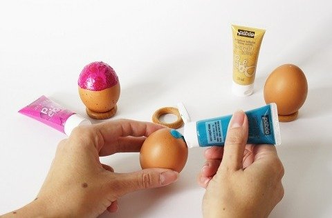 - Pose chaque œuf sur un anneau en bois pour bien laisser sécher la peinture.